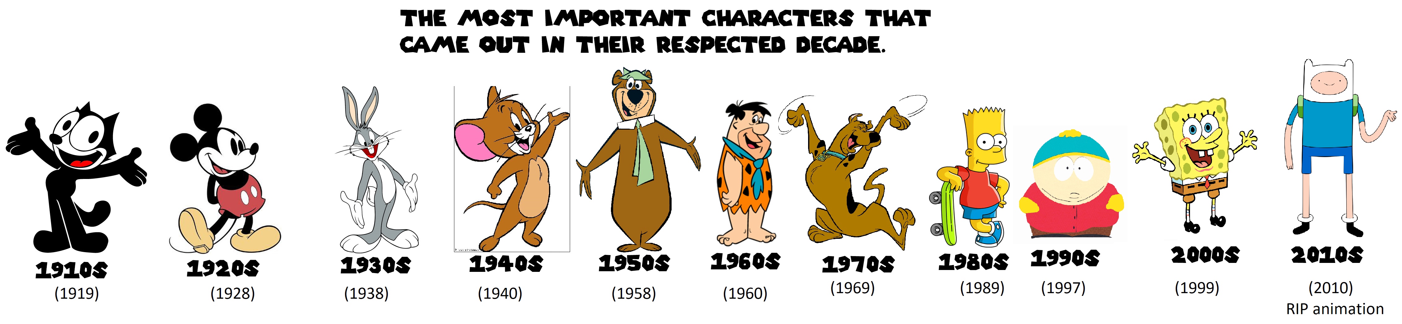 >1920sFelix, Oswald, Mickey>1930sPopeye, Daffy (if you're gonna shill Porky because he came first then you have to shill Bosko)>1940sBugs, Donald/Goofy, Tom & Jerry>1950sGerald McBoing-Boing, Tom & Jerry>1960sFlintstones (and HB slop)>1970sScooby-Doo>1980sTransformers, Inspector Gadget, anti-drug PSAs>1990sThe Simpsons, Pink and The Brain, Beavis & Butthead, Pokemon>2000sSpongeBob, Ed Edd n Eddy, Powerpuff Girls>2010sAdventure Time, Steven Universe, Rick & Morty>2020sInvincible, Smiling Friends might join/overtake it