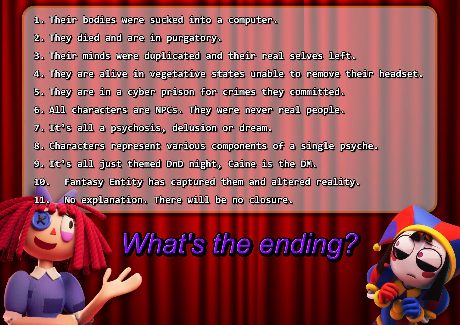 >>152133344what ending will this series get?>caine gets pissed off and turns everything into a torture dungeon>jax abstracts and kills everyone>they find the exit and escape
