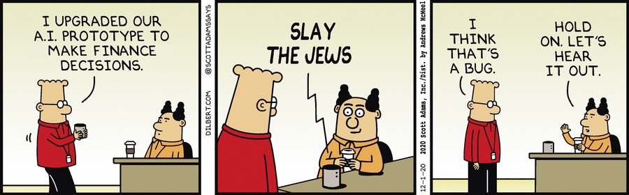 The Dilbert cartoon was lots of fun. Sad the guy seem to have fallen of a wagon after getting hit with a very low tier redpill
