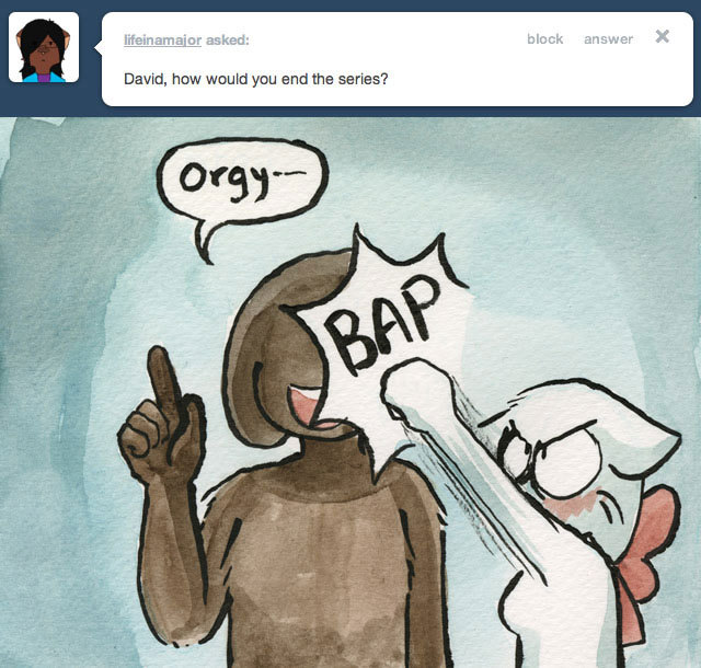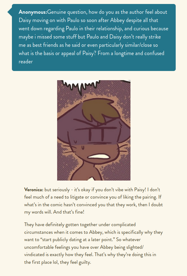 >>152153910Suit let her start answering questions on her Tumblr again, after heavy filtering. Remember her author comments full of irony and passive aggressiveness? Imagine that but to people just asking about their own interpretations of the comic while she keeps pushing for a narrative not shown in the comic itself, and slowly showing she's losing her patience