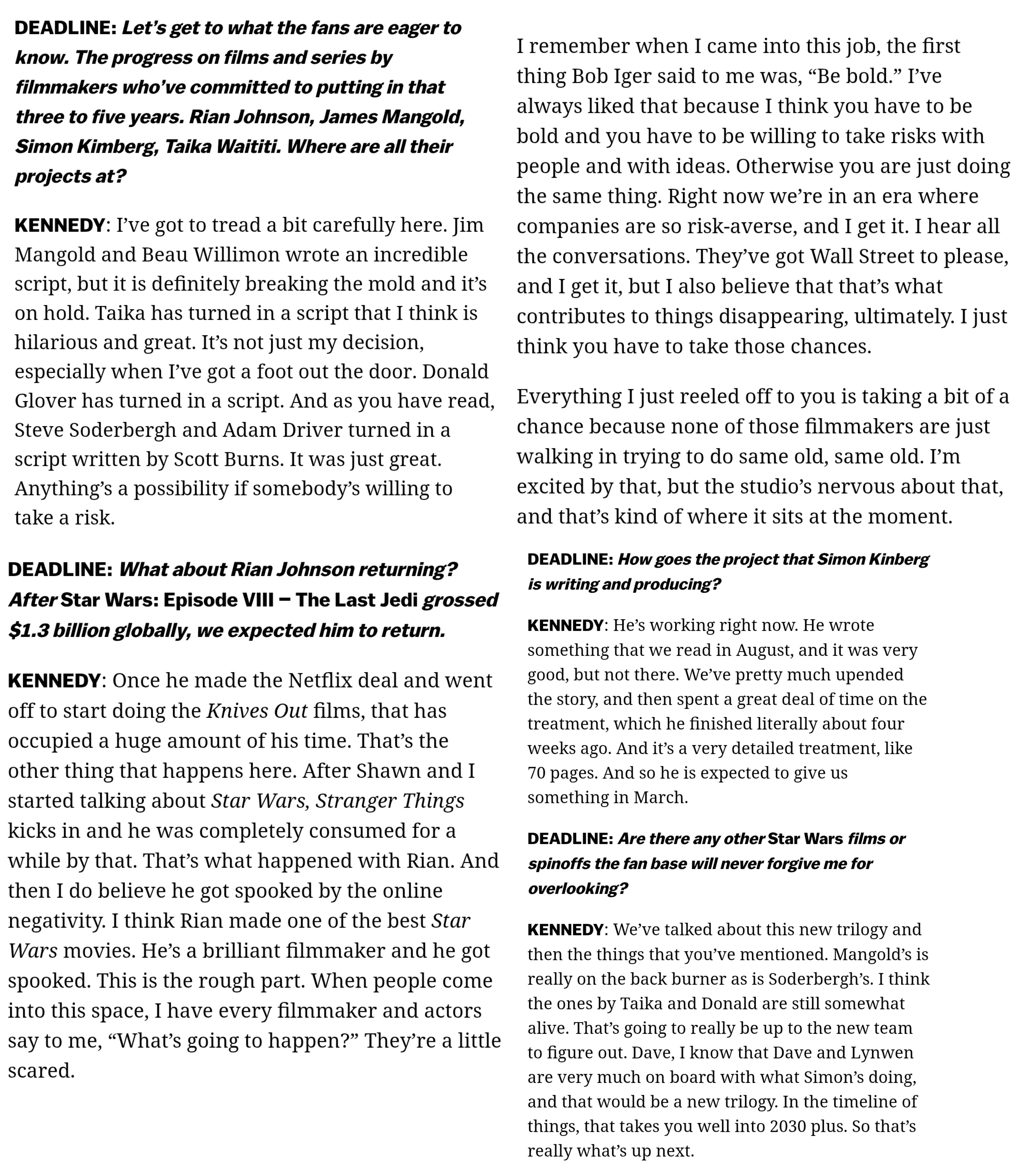 Full updates on the announced/dead projectsKinda vindicating to see her throw Disney and Iger under the bus on her way out. Tons of turned in scripts that were shredded because they were too risky
