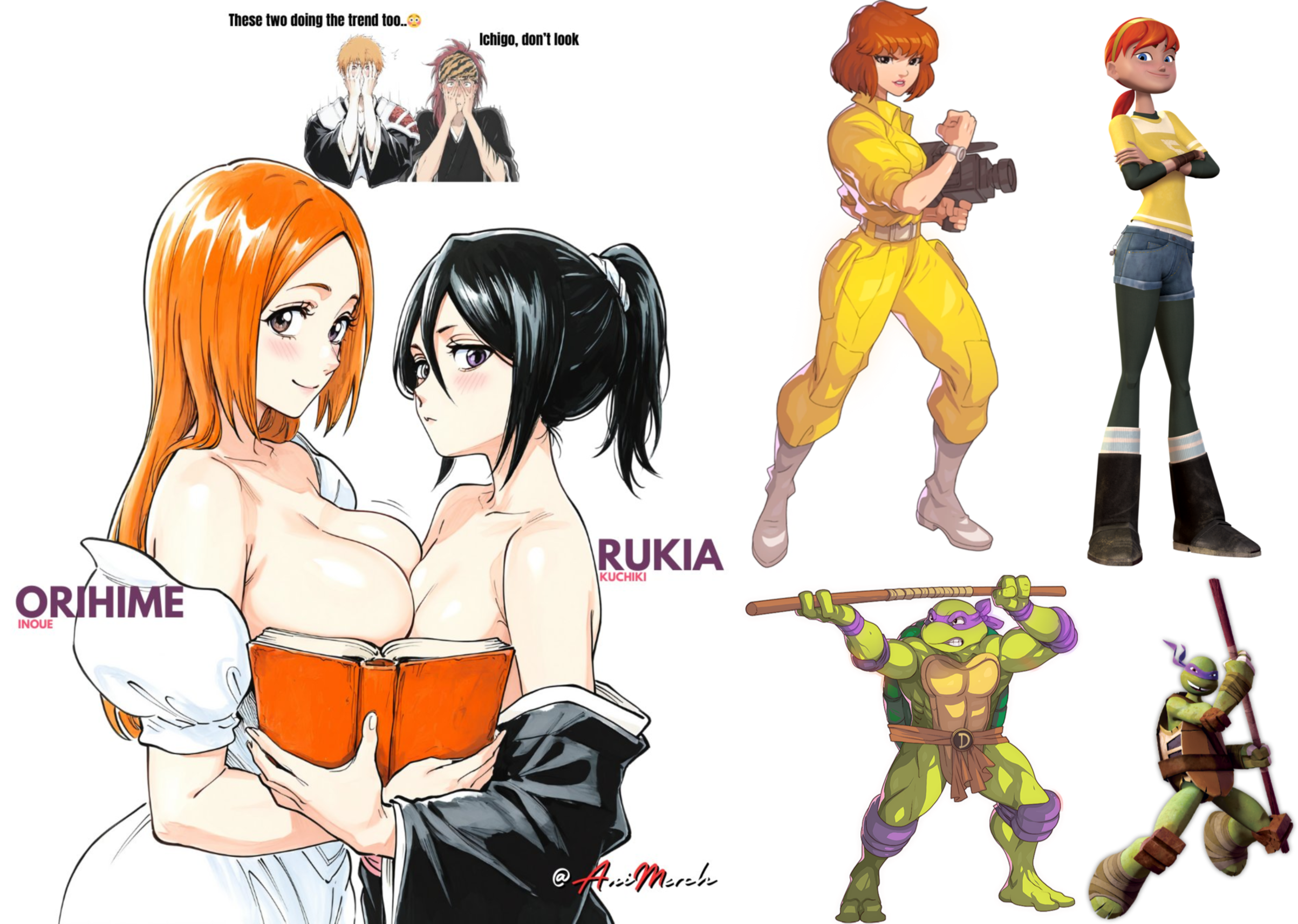 Requesting this meme with April and DonatelloChange the book for pizza cardboard and have both of them holding a slice