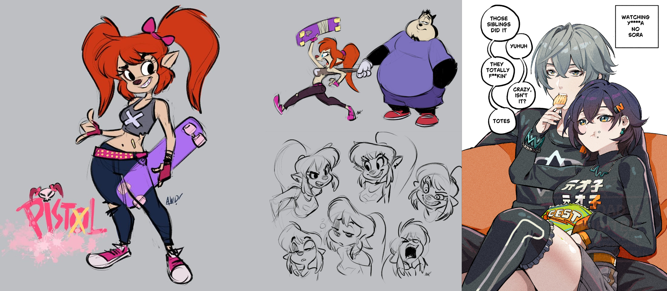 Requesting Echo from Clown Corps having a wardrobe malfunction, kind of like the comic on the far right. The top-left reference is her ‘villain’ uniform, and the bottom one is her civilian look.