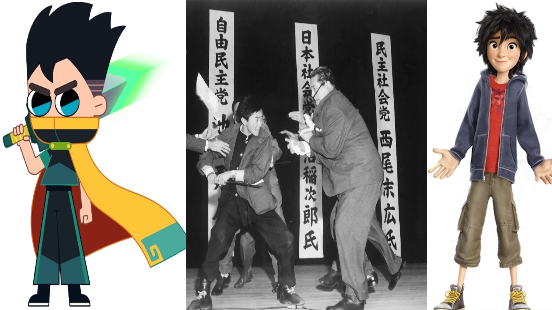 Requesting a crossover pic involving Hiro Hao from Kung Fu Wa attacking Hiro Hamada from Big Hero 6, using this pic of Inejiro Asanuma's assasination as reference