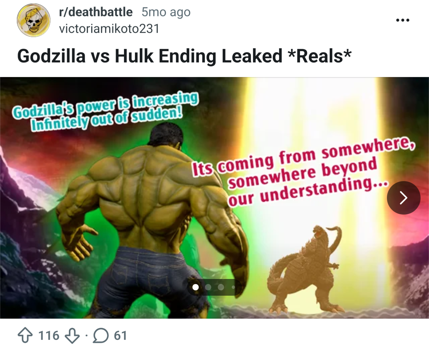 >>152171543Fuck no, he's just jumping bandwagon once again. He did it with Joker, he did it with Dante, and he'll certainly do it to Godzilla https://www.reddit.com/r/deathbattle/comments/1mso0l8/godzilla_vs_hulk_ending_leaked_reals/