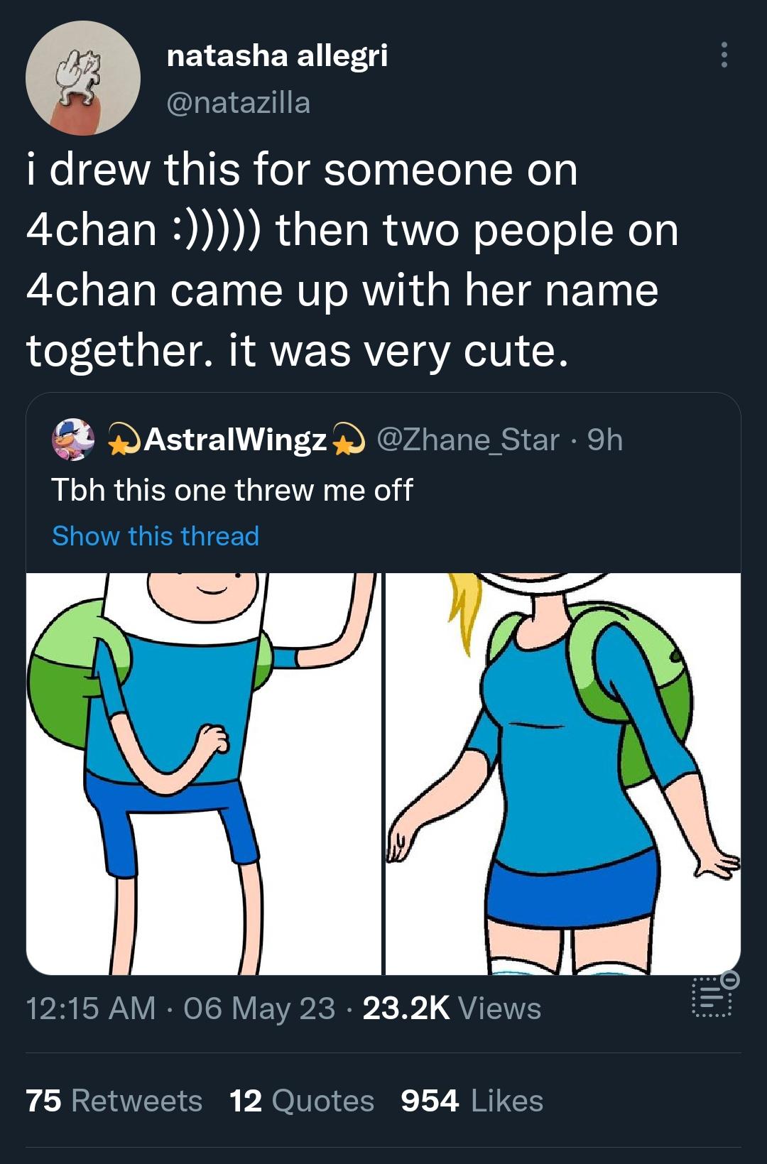 >>152184253Back when "pros" lurked 4chan and weren't scared too.Now no one wants to be associated and or seen on this hell hole (I get it).I wonder if the people who created her name or asked for the art are still around...or even alive anymore.They got ZERO monies but can forever feel proud their request and creativity sparked an entire spin off years later.