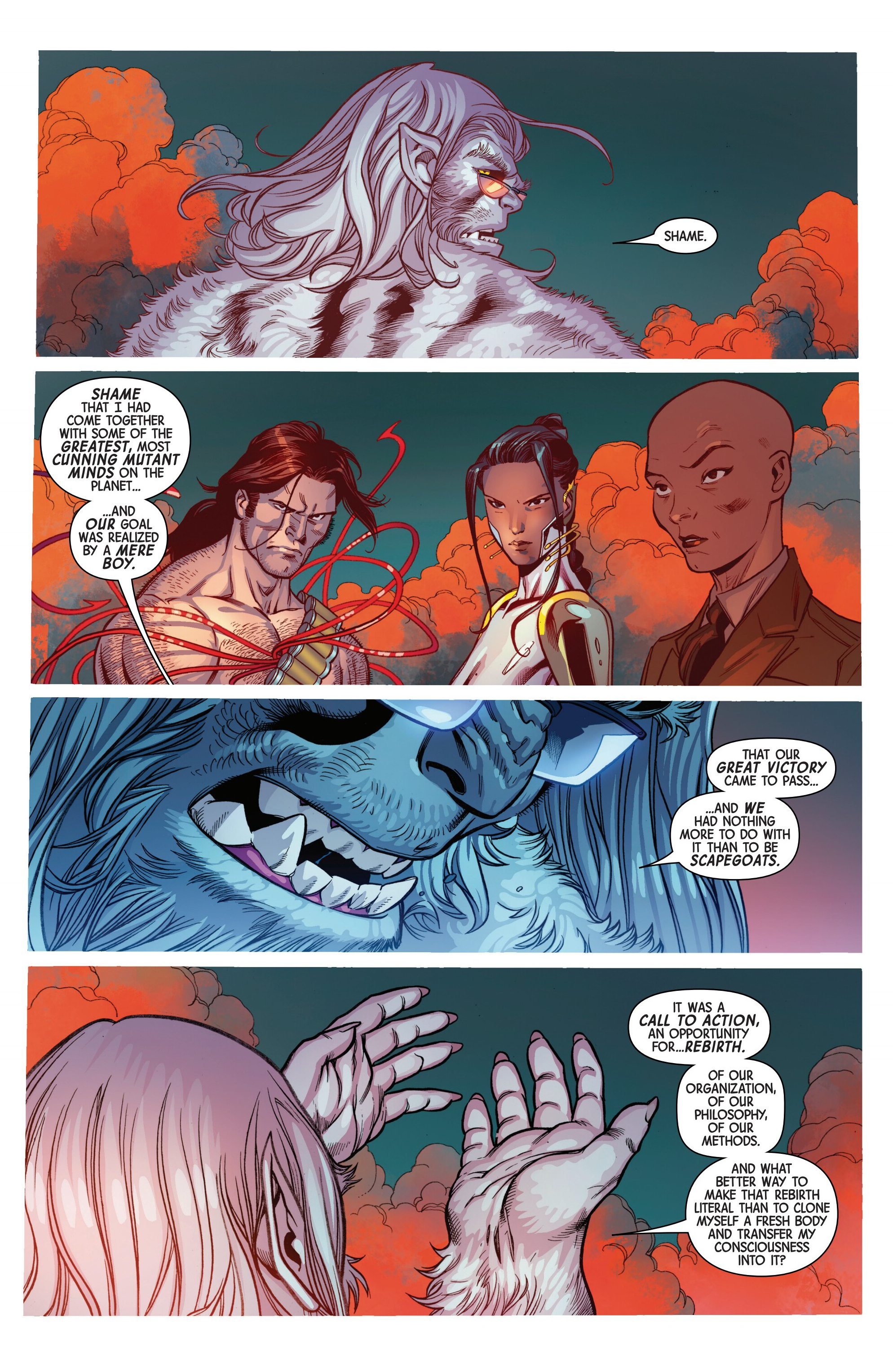 >"Shame that I had come together with some of the greatest, most cunning mutant minds on the planet..."Hold it right there. With the exception of Cassandra, these guys are not the greatest mutant minds on the planet and you know it. Hell, Wyre isn't even a mutant!>"And what better way to make that rebirth literal than to clone myself a fresh body and transfer my consciousness into it?"So is looking like AoR-Beast intentional on your part then?