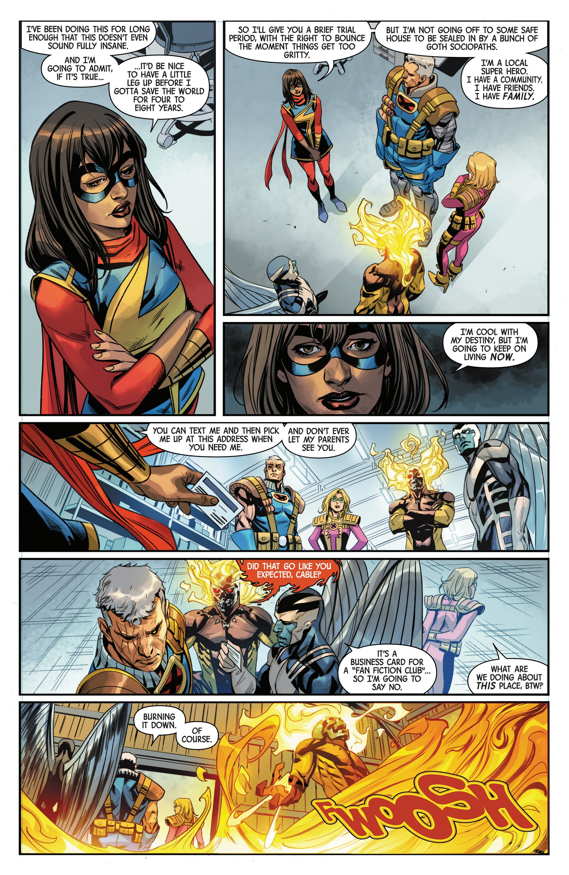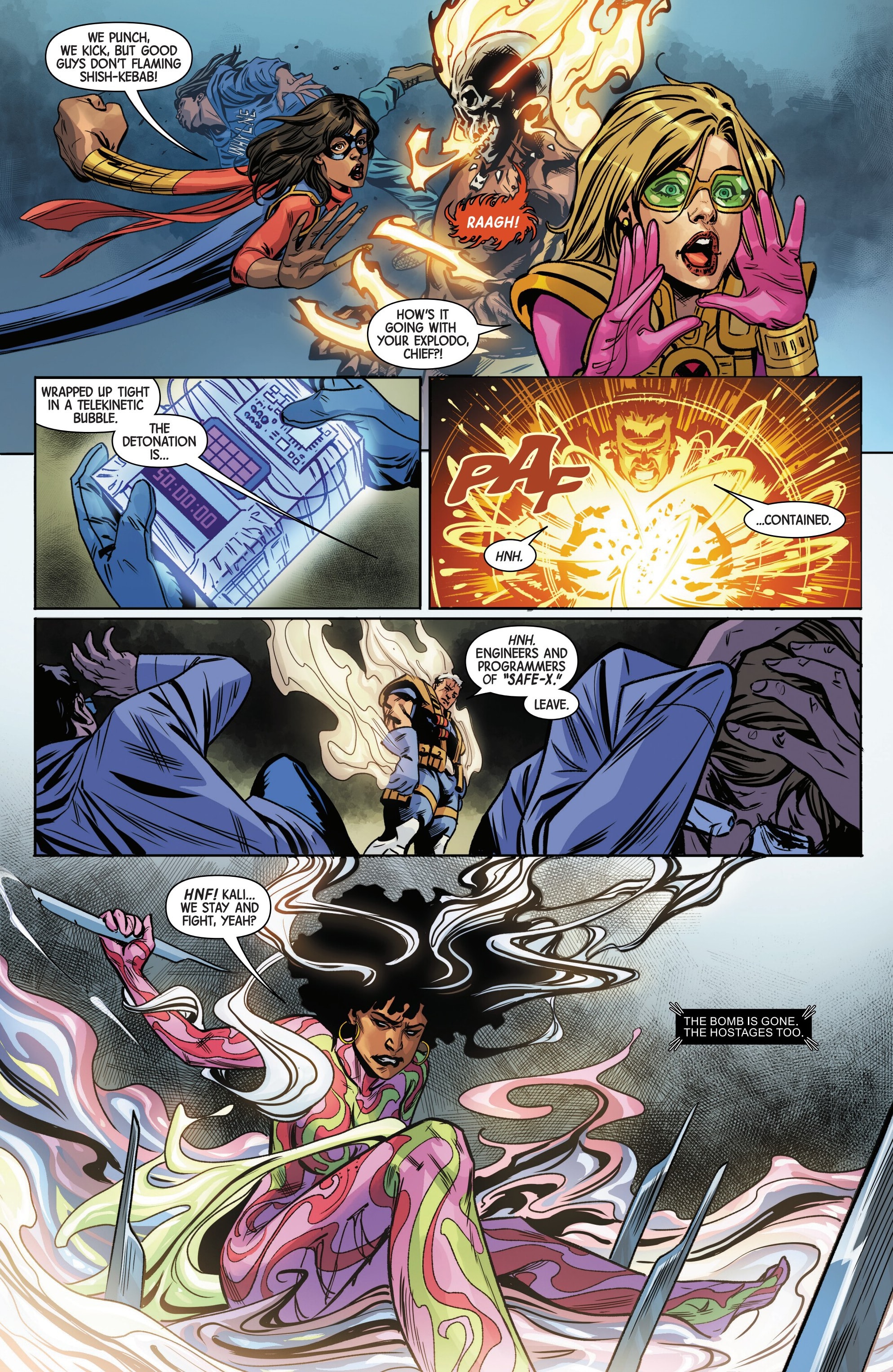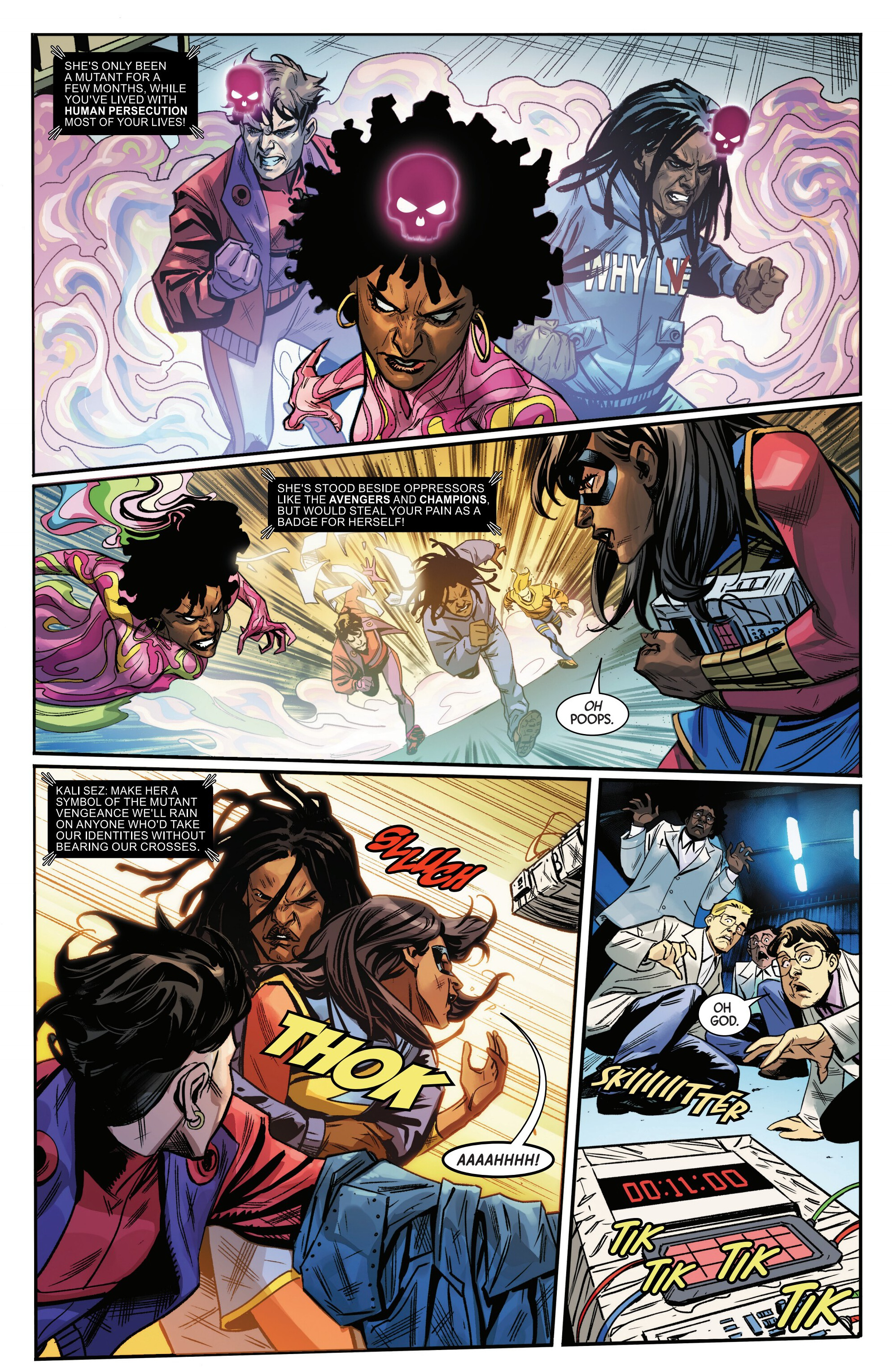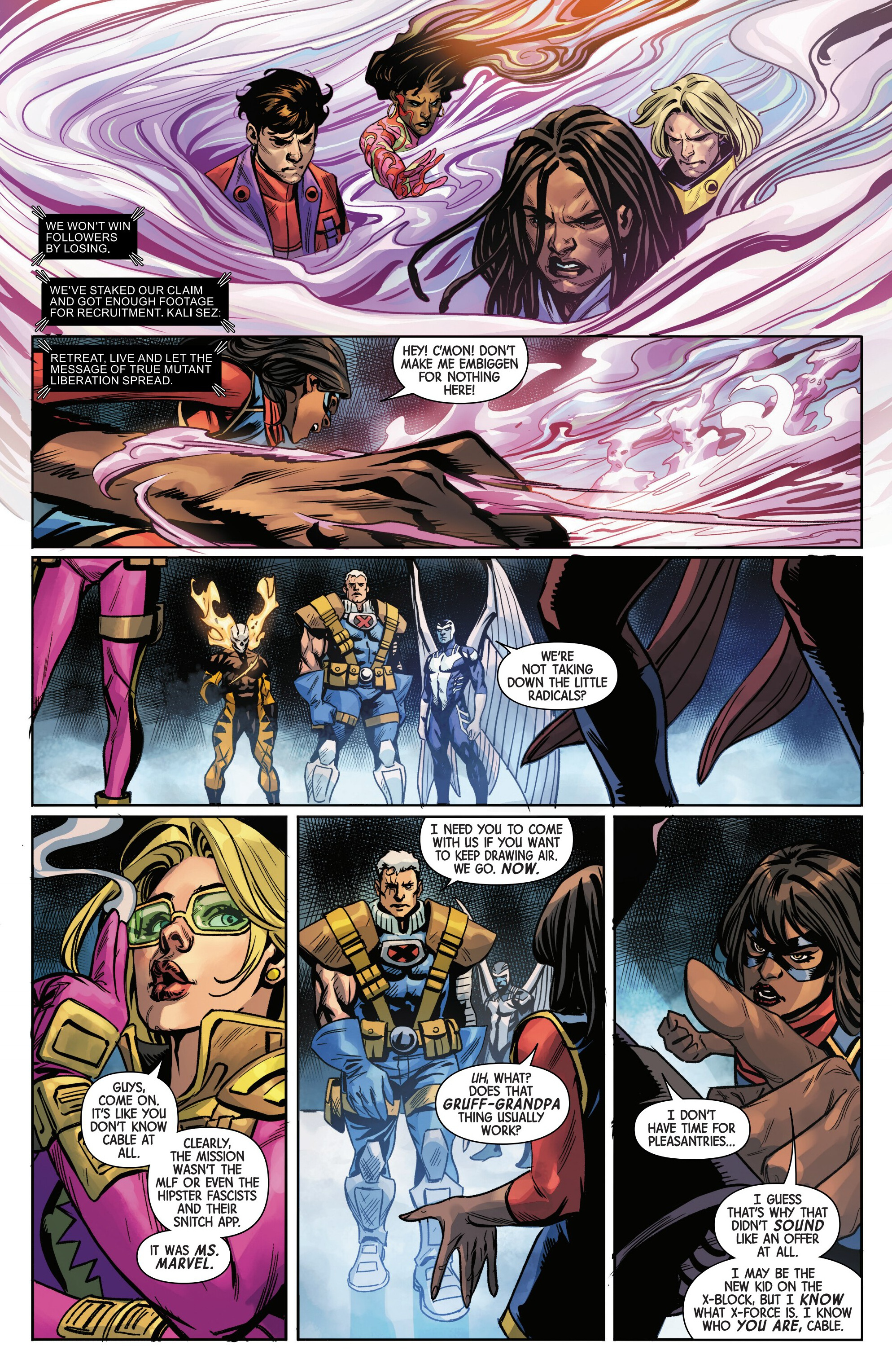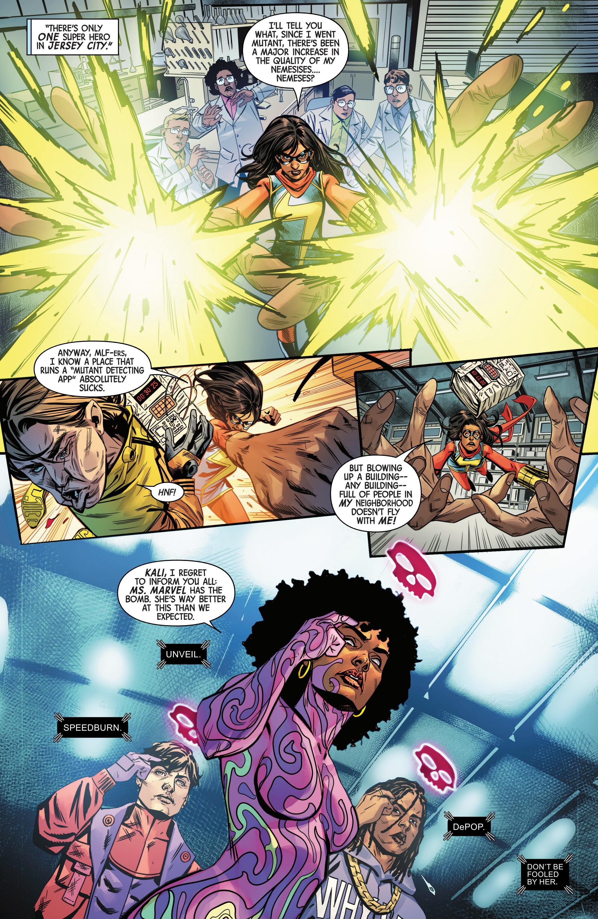 Oh hi Kamala, fancy seeing you here fighting these new MLF members. Only one of these guys seem to be a pre-existing character, and that's Unveil:>https://marvel.fandom.com/wiki/Unveil_(Sharesse)_(Age_of_X-Man)_(Earth-616)