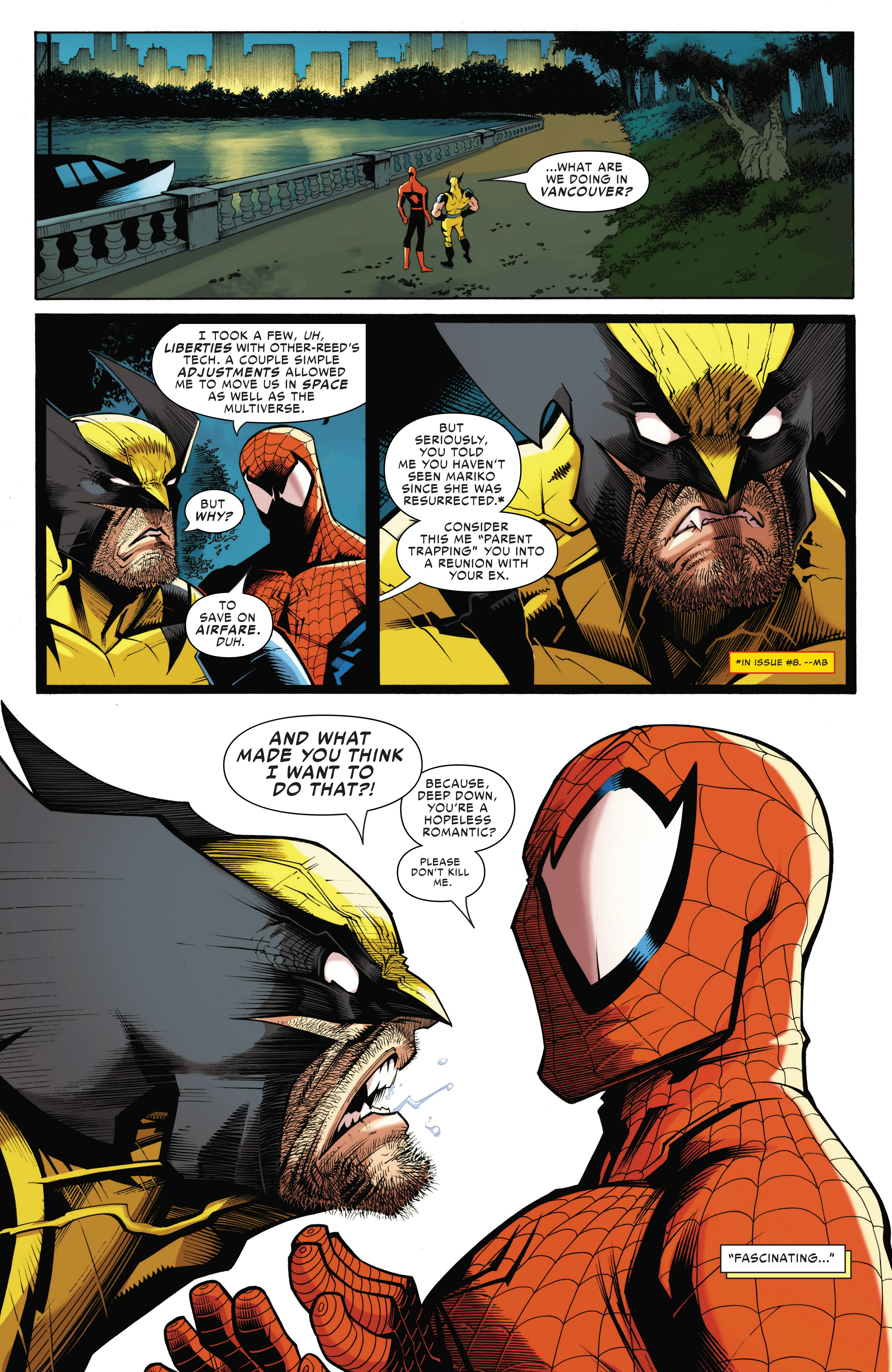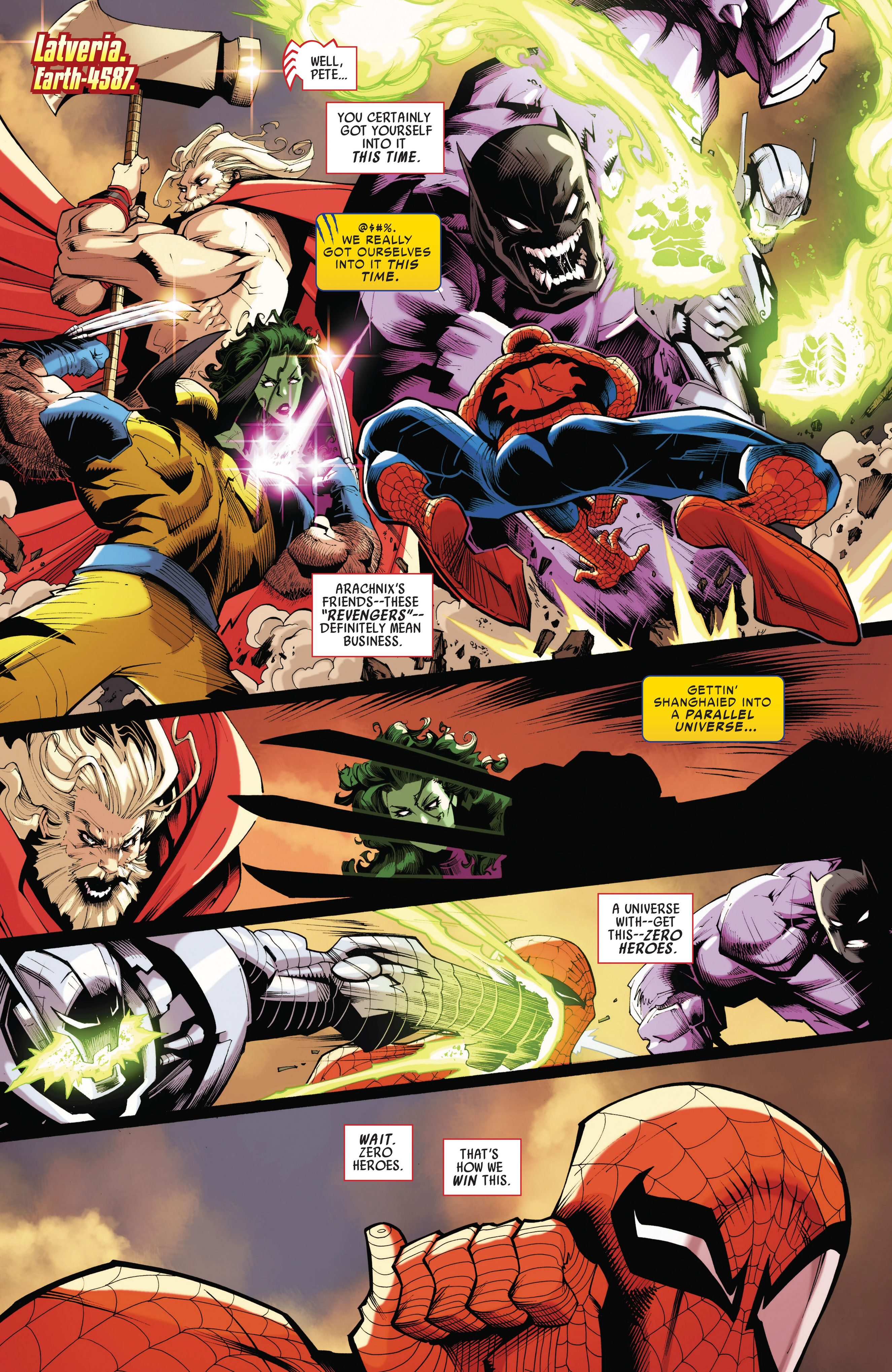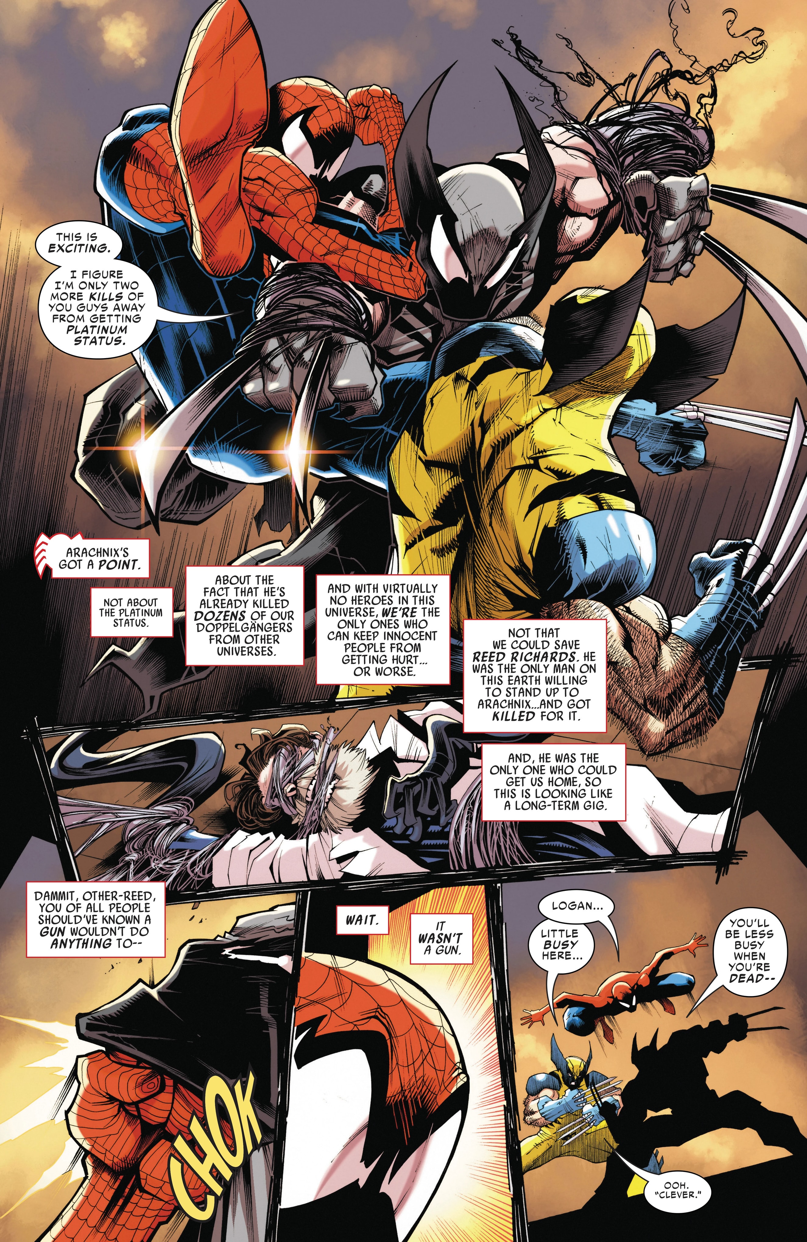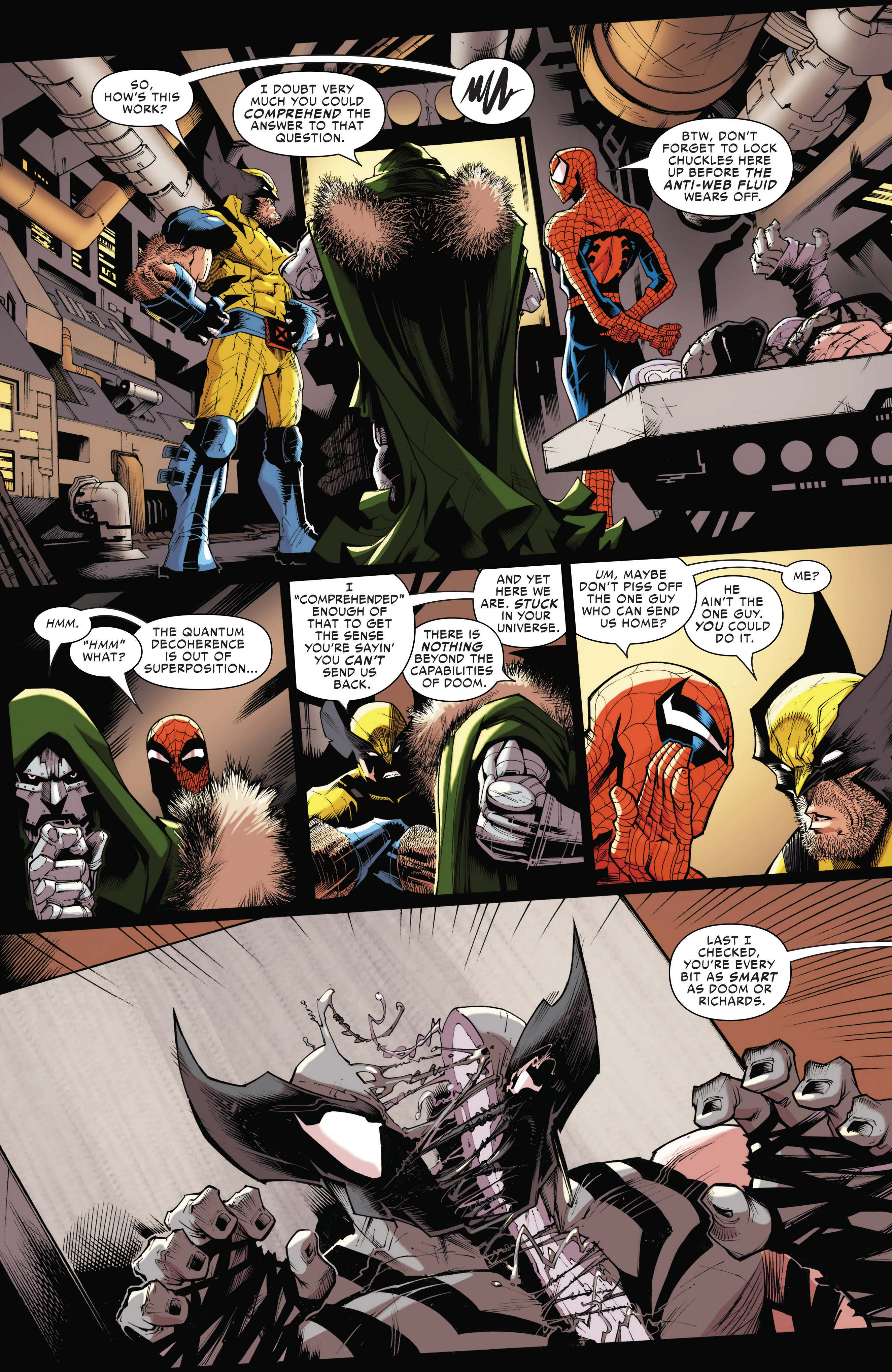 Previously in Peter and Logan's team-up adventures, the duo got teleported to Earth-4587 to deal with Arachnix! After managing to narrowly escape him, they both returned to Reed-4587 and confronted him about the multiple previous variants of the duo that had faced Arachnix and died, only for Reed-4587 to reveal that those variants - like Arachnix - neither had Spider-Sense nor adamantium bones. Unfortunately for Peter and Logan, Reed-4587 also revealed to them that he could not send them immediately back to Earth-616, meaning that Arachnix would have enough time to come back and fight them again.Peter devised a plan to defeat Arachnix, by having the duo go pick a fight with Arachnix's team the Revengers to distract him from getting shot by Reed-4587. But the Revengers were one step ahead, as they not only were able to ambush them before the plan could be pulled off, Arachnix kills Reed-4587, trapping Peter and Logan in this reality!