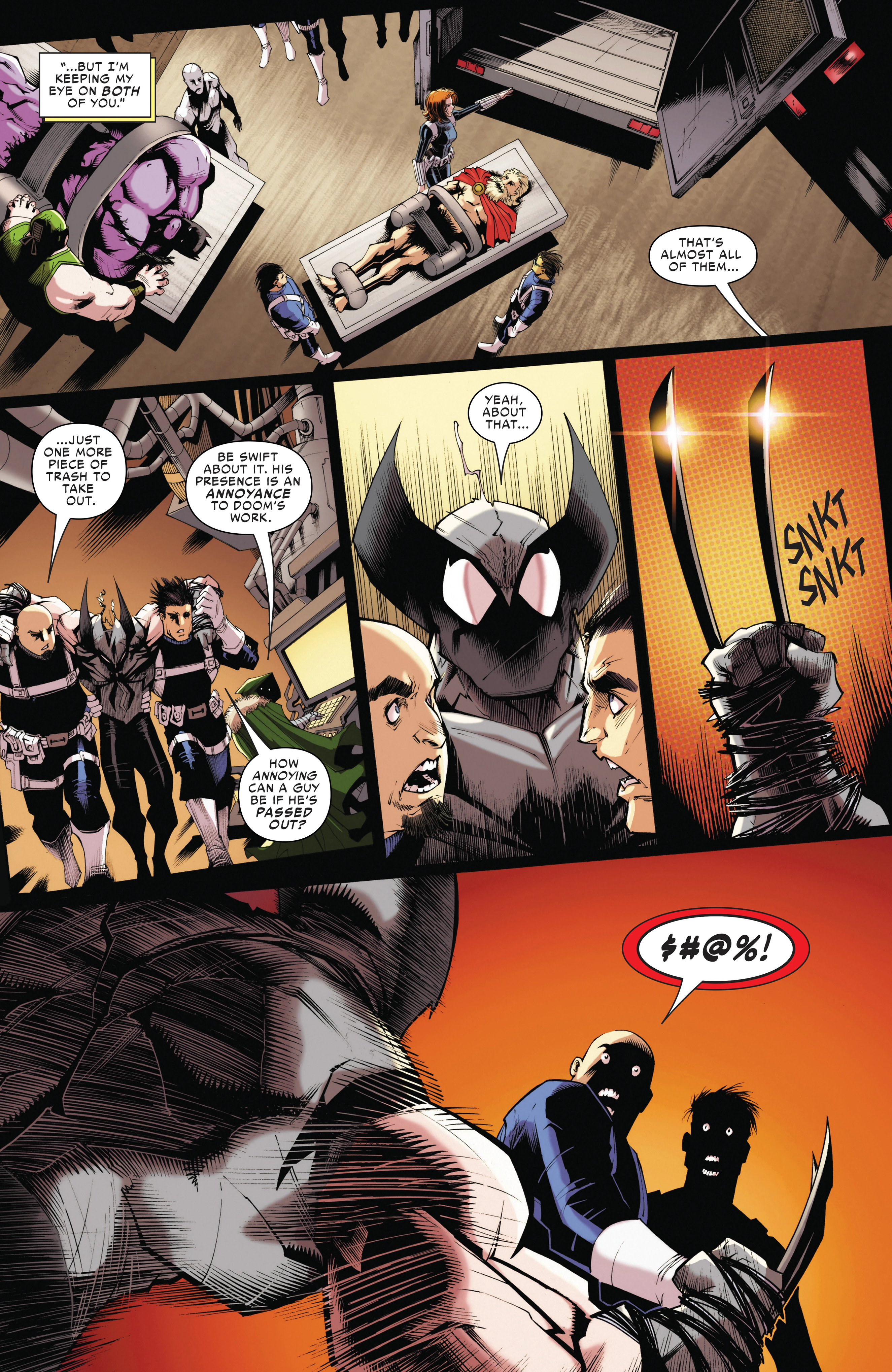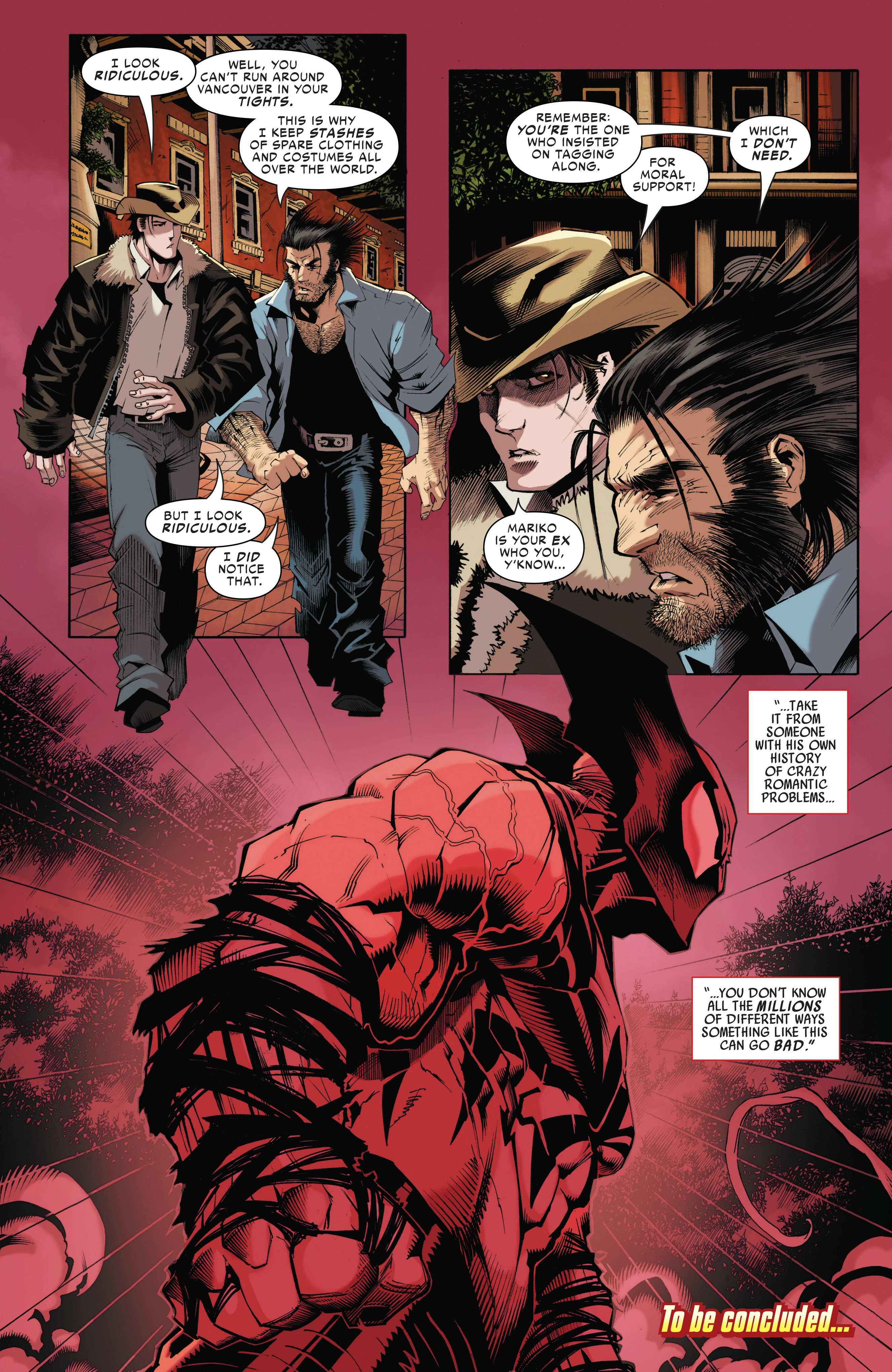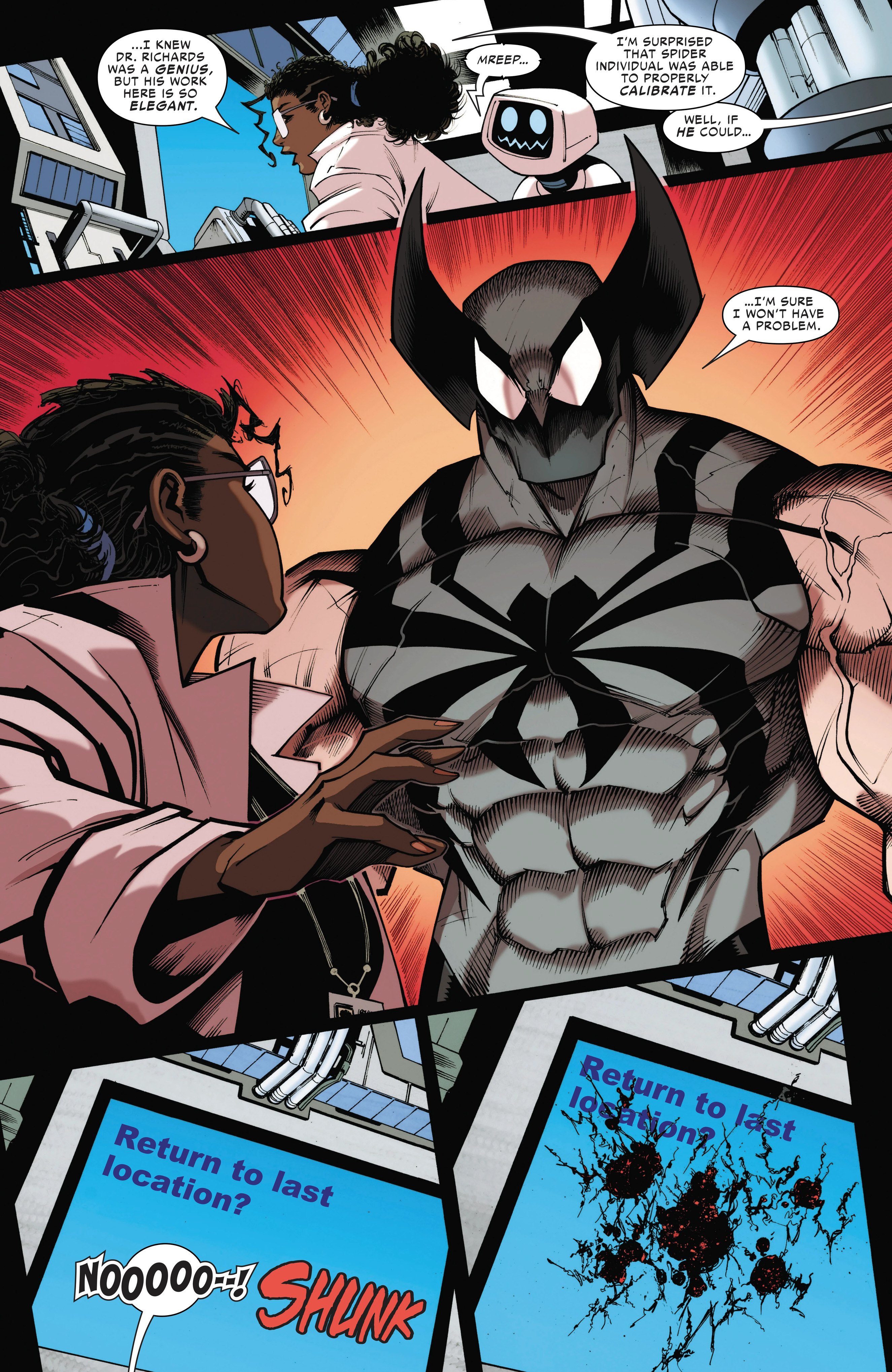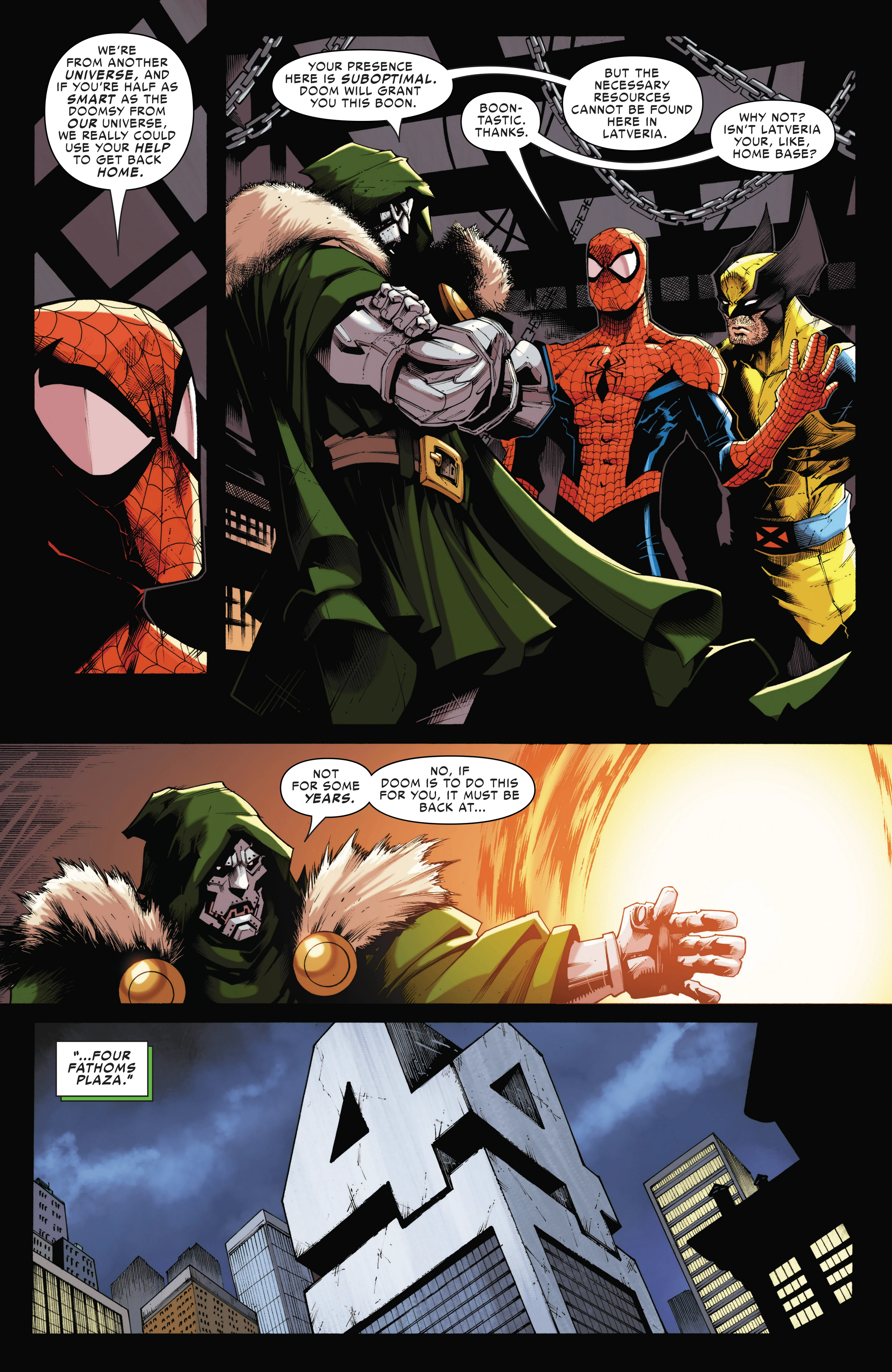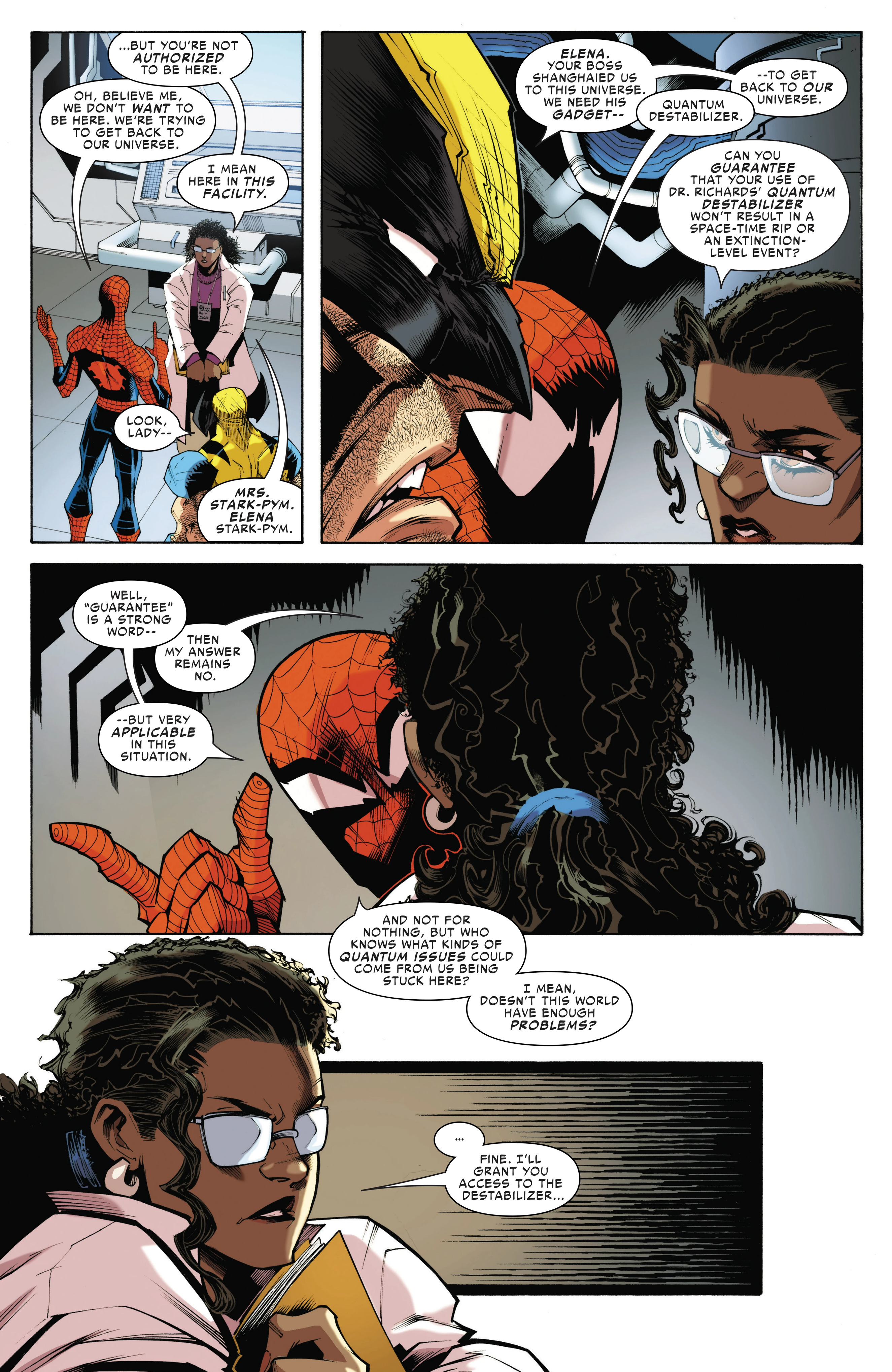 Previously in Peter and Logan's team-up adventures, the duo got teleported to Earth-4587 to deal with Arachnix! After managing to narrowly escape him, they both returned to Reed-4587 and confronted him about the multiple previous variants of the duo that had faced Arachnix and died, only for Reed-4587 to reveal that those variants - like Arachnix - neither had Spider-Sense nor adamantium bones. Unfortunately for Peter and Logan, Reed-4587 also revealed to them that he could not send them immediately back to Earth-616, meaning that Arachnix would have enough time to come back and fight them again.Peter devised a plan to defeat Arachnix, by having the duo go pick a fight with Arachnix's team the Revengers to distract him from getting shot by Reed-4587. But the Revengers were one step ahead, as they not only were able to ambush them before the plan could be pulled off, Arachnix kills Reed-4587, trapping Peter and Logan in this reality!
