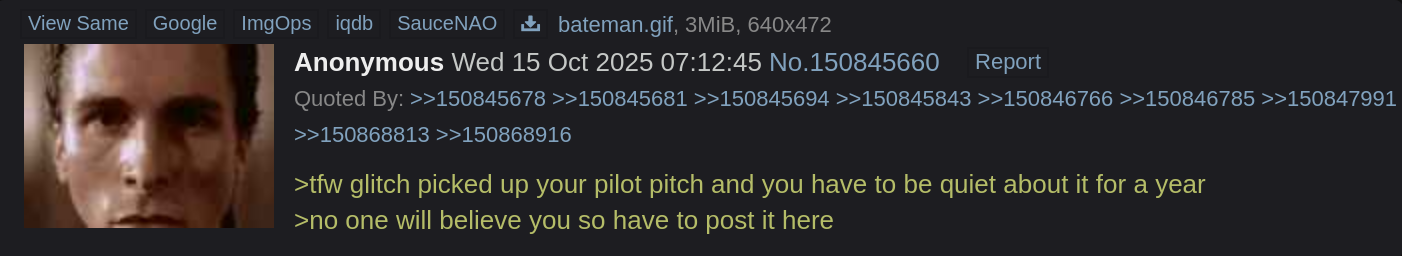 >>152232268Just a few clowns trying to derail the thread. Honestly, everyday behaviour on 4chan.>>152232272At least his vision has matured enough in that time for me to suspect that with Glitch funding it, this show would reach a critical mass needed to grow.