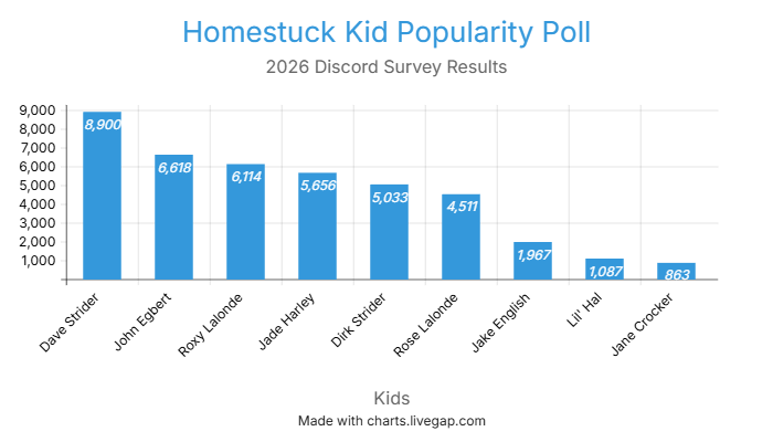 >>152255887>>152255887And here we go. I'm still not over Nep lapping Kanaya like this. Also surprised Eridan is so low, I always thought he had a ton of fangirls. Then again I might just be projecting my memories of the Murderstuck era fandom.