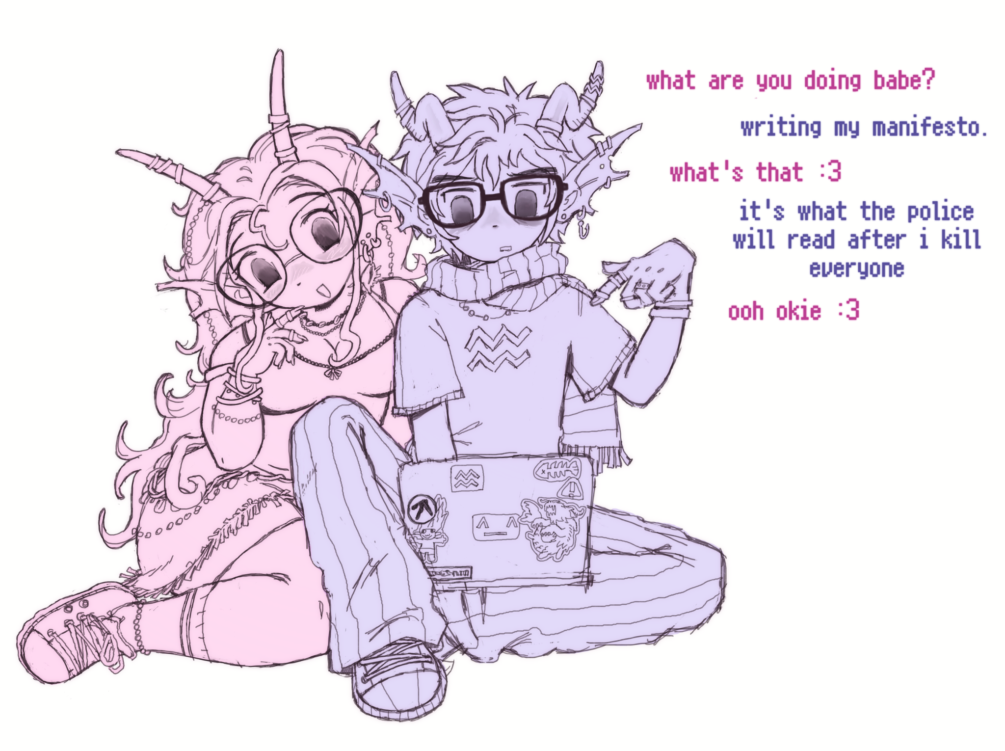 >>152255259This is pretty good anon! You have very clean lines and I like the expressions John and Jade have, John looking all embarrassed but happy, Jade just sorta zoning out from the sheer thrill of skinship (maybe the edibles are beginning to kick in too). You should really keep at it and show us anything you got! OC is the lifeblood of these threads.