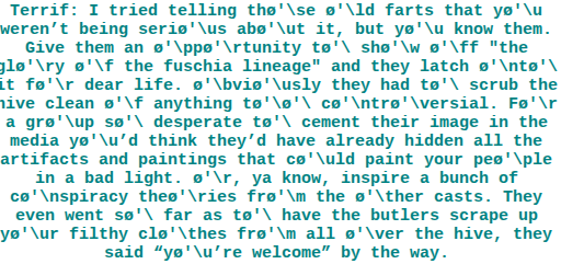 >>152257197that's the same person anon. I'm (essentially) the only one with a consistently used typin6 quirk, AND i draw aranea everyday. why do you ask?