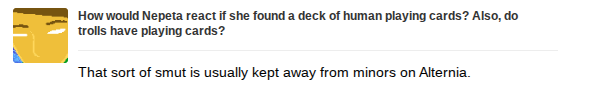 >QOTT: What's your favourite ship, and do you think Homestuck would have improved if it was canon?Well well well. Despite my constant musings and obsession with Prospitcest. I believe the best ship for the work of homestuck as a whole would be spider8reath. It is the most dramatic of the ships that i can think of. And it features the two basically main characters of the comic. If John and Vriska were able to positively influence eachother the story would have gone in a far more straight forward and less convoluted asinine and crazy direction. For better and worse, mostly better though. it is the ultimate strar crossed lovers ship that the story itself shot down. And it is sad to see.