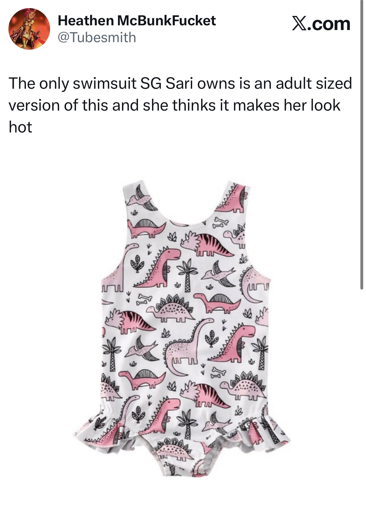 >>152357134I got my wish with the tank top, but if I got to decide another outfit it would be her swimsuit, which would be dinosaur print. >>152358121Not sure. That would be a question for Marty. I’d like to think Sari would think the coat is cool.