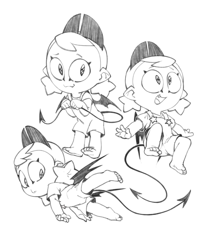 >>152273555There's 6 of each, and sure enough in the credits there's a bit of art showing them in each of their angel and devil pairs.I imagine had it got picked up for a full series, the other devil kids would have shown up plenty of times even with Clem mainly staying on the angel side of the school.