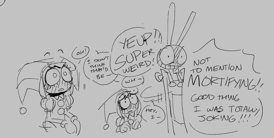 >>152282290>"pom...">"jax, please just... dont">" this is so weird pomni">"how do you think I feel?">"can we agree to nevwr, ever talk about this again?">"no smart comment about wanting me to milk you lower?">"even i have limits "