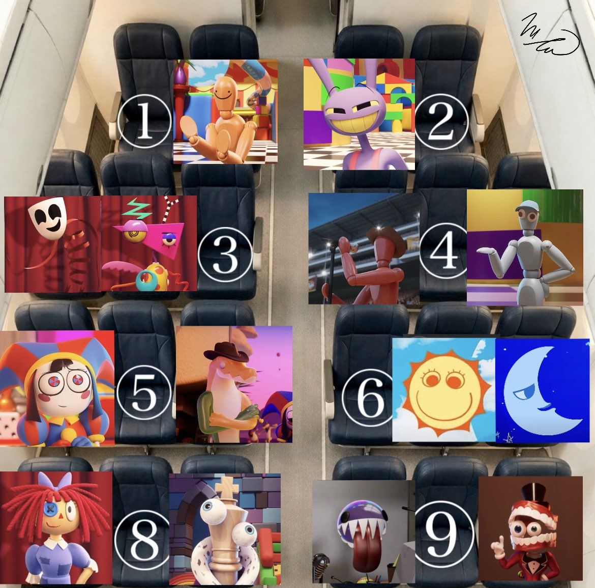 >>1522927023's pretty much fine too. You're not in the middle of Zooble and Gangle so you're not in the way, you've got Disappearing Guy to your other side and he'll, uh, disappear, so that's an open seat, and you've got Gummigoo in front of you who'll probably be talking to Pomni for most of the flight anyway. Abel's easy enough to ignore too. The only actual problem I can see with 3 is that Jax is also in an aisle seat and could probably still fuck with you a bit.