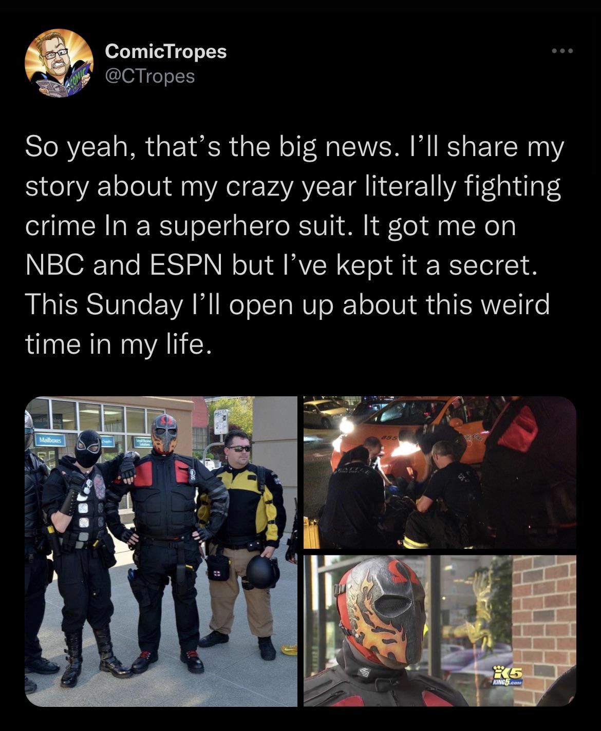 >>152315648>the man didn't just cosplay a hero he worked under Phoenix JonesThat's WORSE. If he was just cosplaying as his OC at cons or something like that I wouldn't bat an eye.