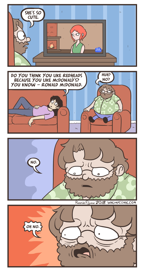>>152332154Oh fuck, that explains why the new comic girl won't be permanent- Ronnie likes redheads (which is based). Almost every comic with a flashback or a vaguely cute girl is a redhead. The "want to go to prom?" comic? Redhead. "Oh no, I'm in love with someone who doesn't exist"- redhead. IT'S GINGERS ALL THE WAY DOWNBECAUSE RONALD MCDONALD HAS RED HAIR