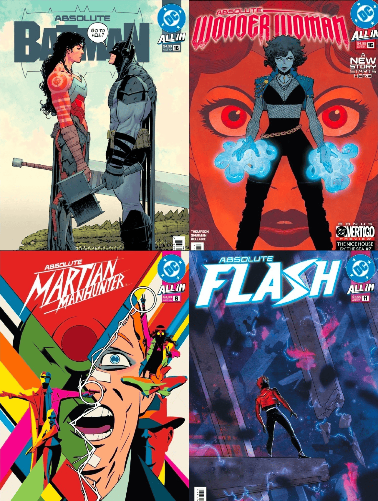 >Wonder WomanGreat.>BatmanGreat.>SupermanAwful. Boring. Artist reminds me of Greg Land.>ManhunterI like it............?Haven't read Flash and Lantern yet.