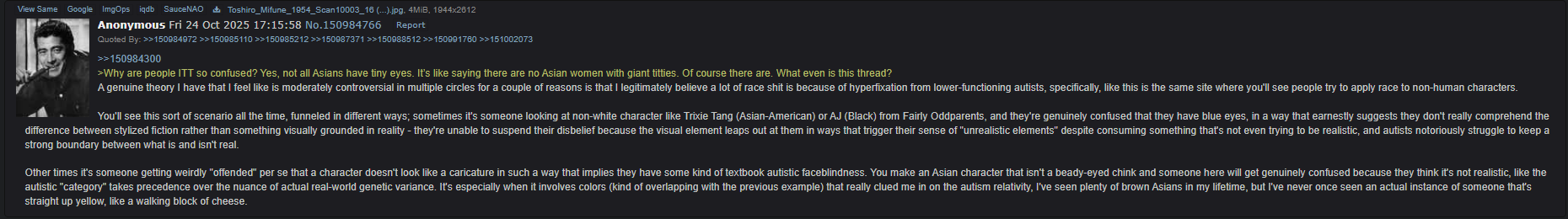 >>152327982>they don't need to be neon yellow, they can be slightly brownI've always wondered if this is like some kind of autism thing, cause I'm reminded of when Chris-chan had Obama painting the White House black in Sonichu just because Bob made a joke about that and Chris clearly took it unironically seriouslySame kind of deal here, you make a joke about Asians looking like lemons and an autist takes that dead seriously even though you're far more likely to run into an Asian guy that looks bronze as fuck