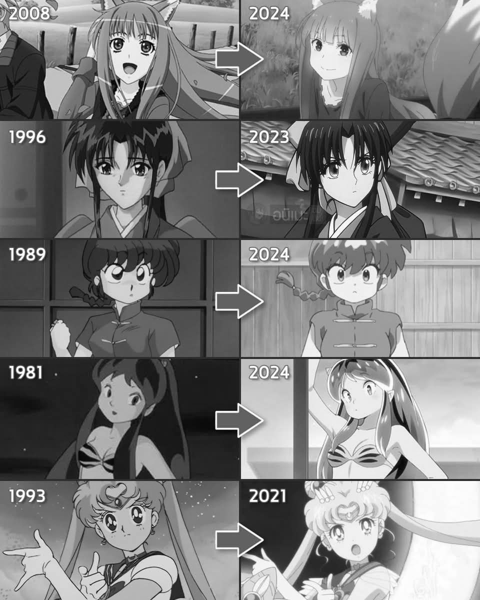 >>152328479>>152328701>>152331723>>152332030But how much of the difference in brightness is due to the quality of old rips vs getting the raw video files? How much is just due to the style at the time, like how all of the anime on the right have thinner, rounder linework?