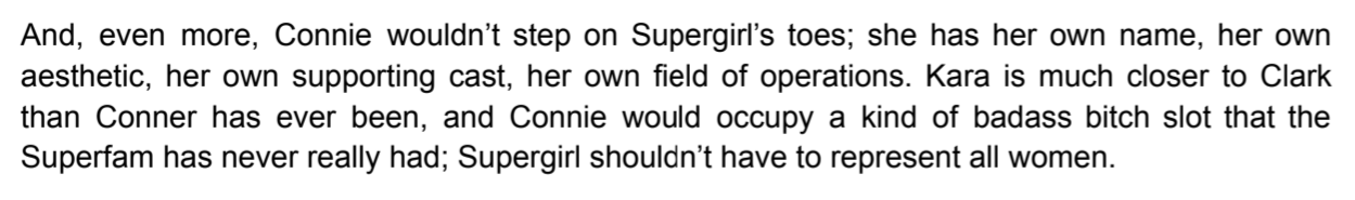 >>152332185I don't know if I'd call it a failed pitchThey actually published the first chapter. Had Conner date Miss Martian and have all this angsty talk and dye a red streak in his hairIf the pitch failed, then how did that story even get printed? Did Vissagio just not tell the editors her plans? Was no one paying attention? Did some assistant editor okay it because they thought no one cared about Conner as a boy, and then it came across a higher manager's desk and they had to pump the brakes but it was too far in development to pull that first chapter?