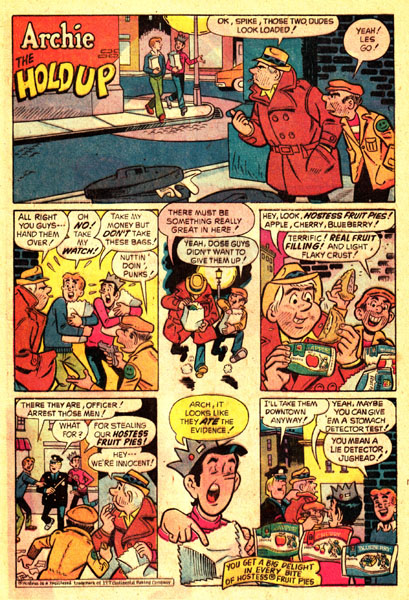 >>152334694I forgot all about these Hostess fruit pie comics. I remember this one being one of my favorites where Jughead says that the crooks "ate the evidence." I remember even back in 2006 or so. You could get something like a Little Debbie's zebra cake for a quarter. During the 90s you could get Home Run Pies for a quarter. There are still these boxed pies for sale, but I rarely eat them anymore. You can get a store brand one for 1.29 at my local stores for regular price. Or like 80 cents on sale.