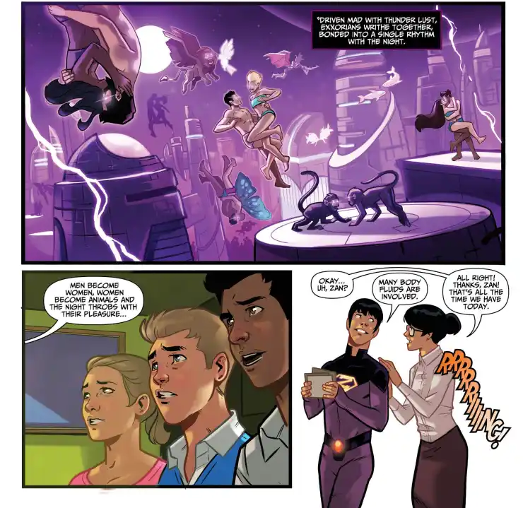 in the most recent (2019) Wonder Twins comics they feature a really odd bit of lore that Exxorians get incredibly horny and uncontrollable whenever they hear thunderthen they featured a scene in which Zan gets this "Thunder Lust" while in gym class and implies he did something incredibly embarrassing (and possibly making him an offender of somw sort) in public which causing people to give him the nickname Thunder LustHow does this bilogical trait and new found reputation affect Zan's relationship with other heroes