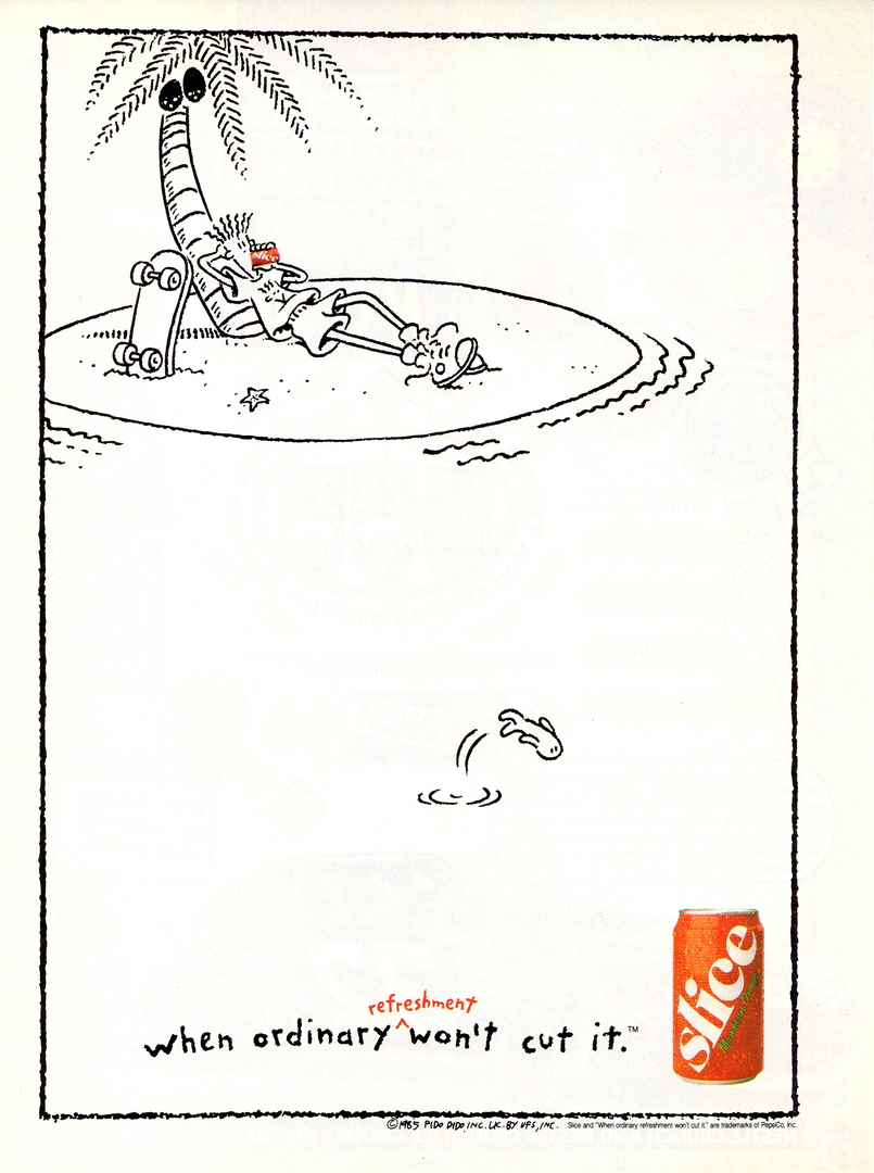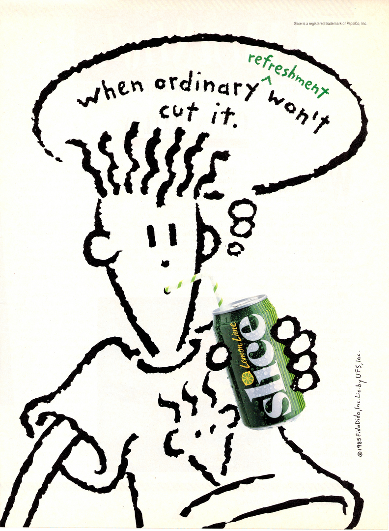 >>152353644>He was the mascot for the original versions of Slice, which were fruit sodas so that's probably where I'm getting my wires crossed with Fruitopia.Pepsi used Fido for Slice since they didn't have distribution rights for 7UP in the US; I think the Slice ads are mostly just 7UP ads with the cans switched out and onscreen text/dialogue altered to match. That's why Cool Spot existed since the US version of 7UP needed a different mascot.