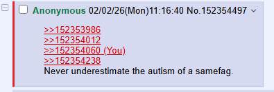>>152353986>>152354012>>152354060>>152354238Never underestimate the autism of a samefag.
