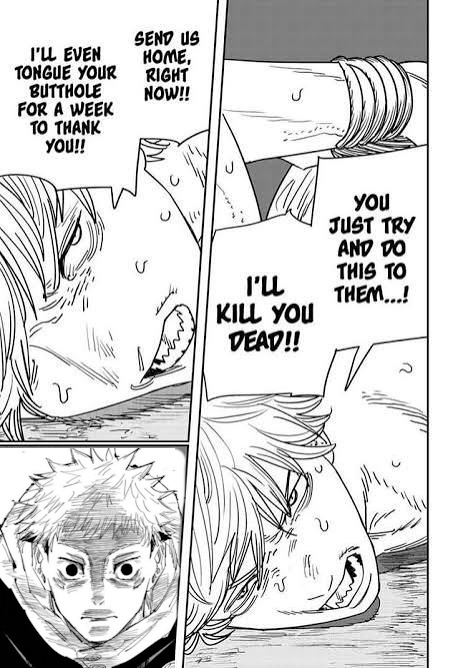 >Yuji cuts Denji's arms and legs, turning him into a nugget >Denji"Ohh, I see... Good thing I brought them all!">Yuji"What do you mean, "them all"?" >Suddenly a stampede of women flood the entire battlefield >Power, Famine, and 1000 random women, all of them bleeding and rushing towards Denji while screaming: "AIIIIIIEEEEEEE SAVE ME CHENSOMAN!"