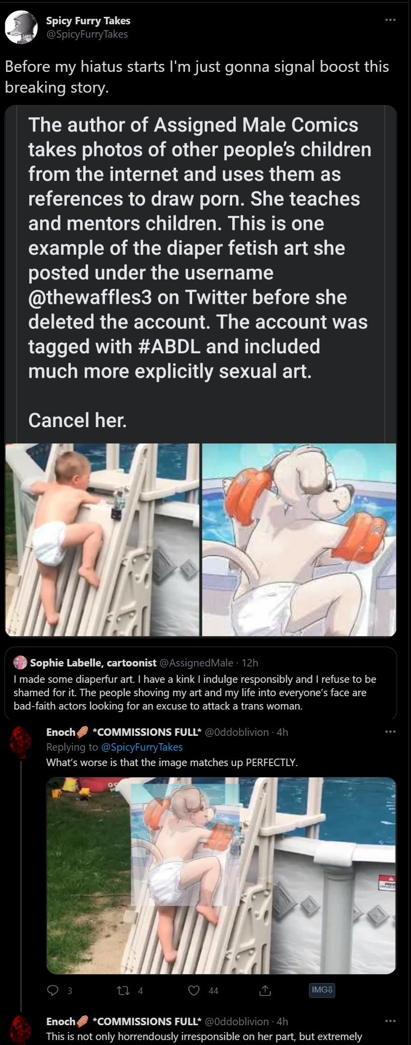 >>152360554they're posted unironically on imgur and i've seen the people there genuinely argue that the diaper fur smut the artist traces babies for isn't actually fetish art so it's okay