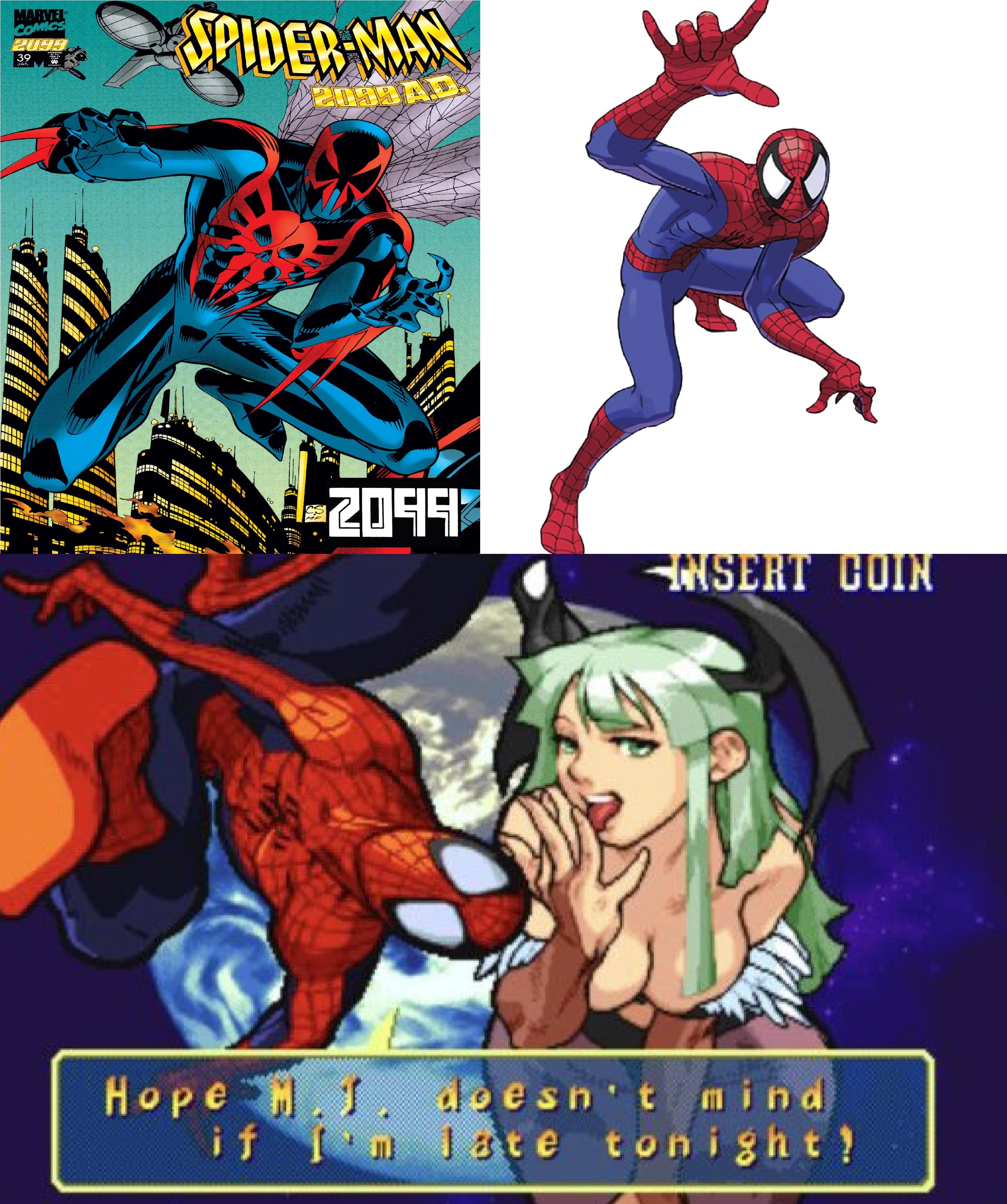 Requesting Spider-Man 2099 ordering a nervous Marvel vs Capcom Spidey to have sex with Morrigan because it's a "canon event".
