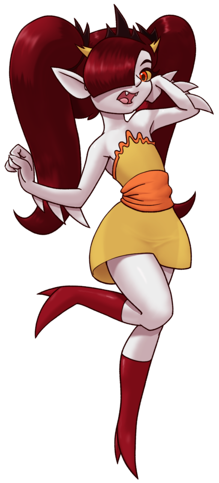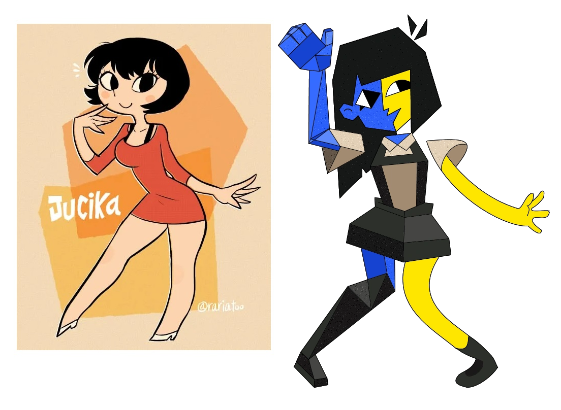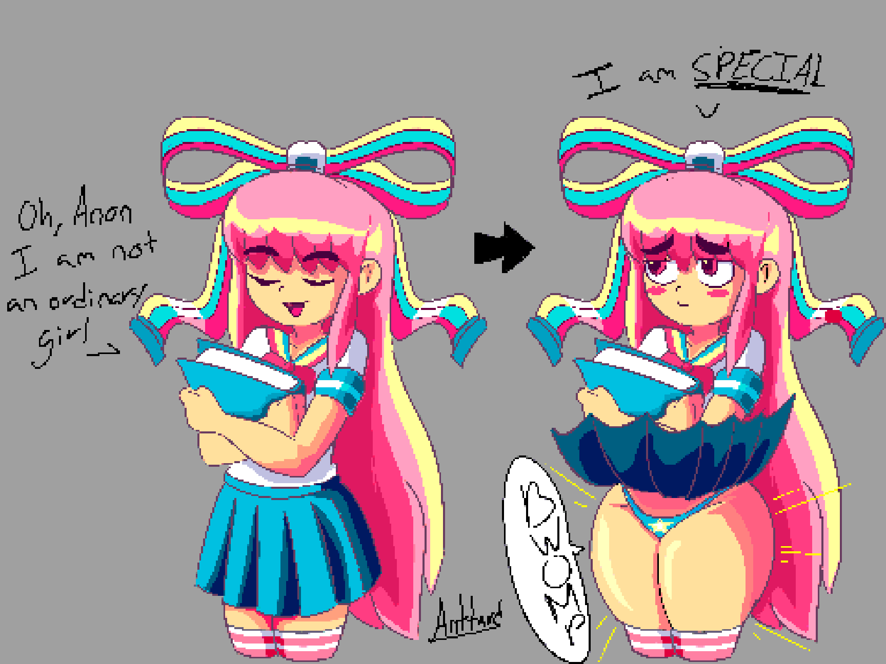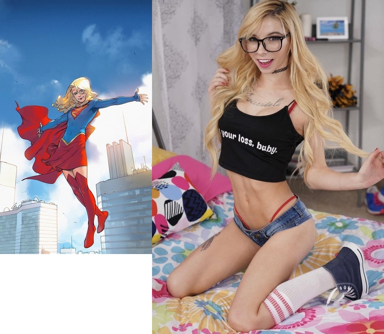 Requesting Aranea Serket posing like the girl on the right pic. Same kind of naughty expression as well, or looking all jolly and happy as in the references on the left.