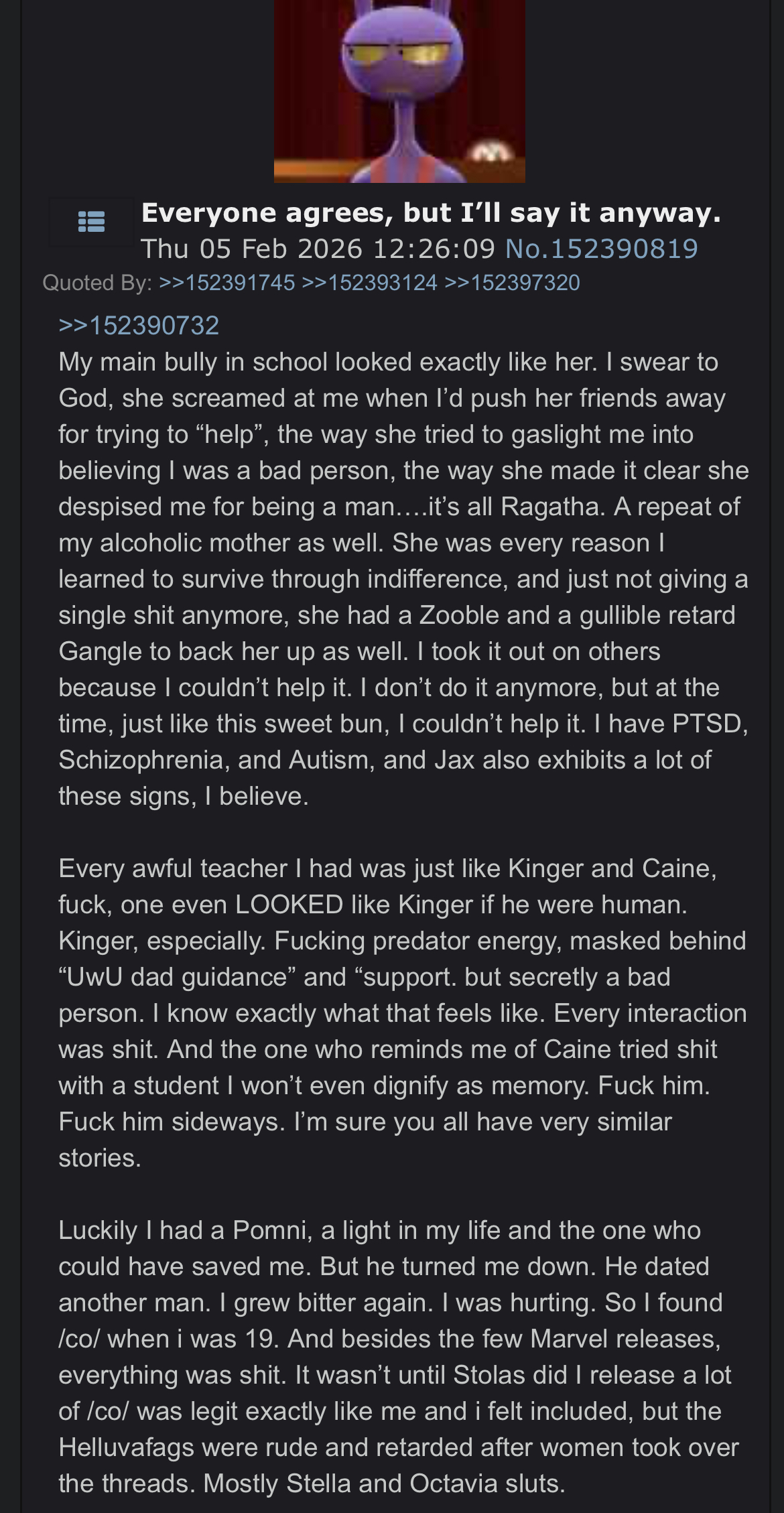 >>152434876>>152434961>>152435057People are harsh towards Jax because he makes his issues everyone else's problem. If you're trapped in a digital hell designed for children with a body you didn't get to choose and are stripped of every function and need that makes you human, the last thing you want is some loser constantly pulling your metaphorical hair screeching about how it's ok because it's just a game. Sure, from the audience's perspective Jax deserves some sympathy because we know he's on the verge of dying, but that doesn't negate his actions up until then and it doesn't absolve him of the responsibility to get better himself.