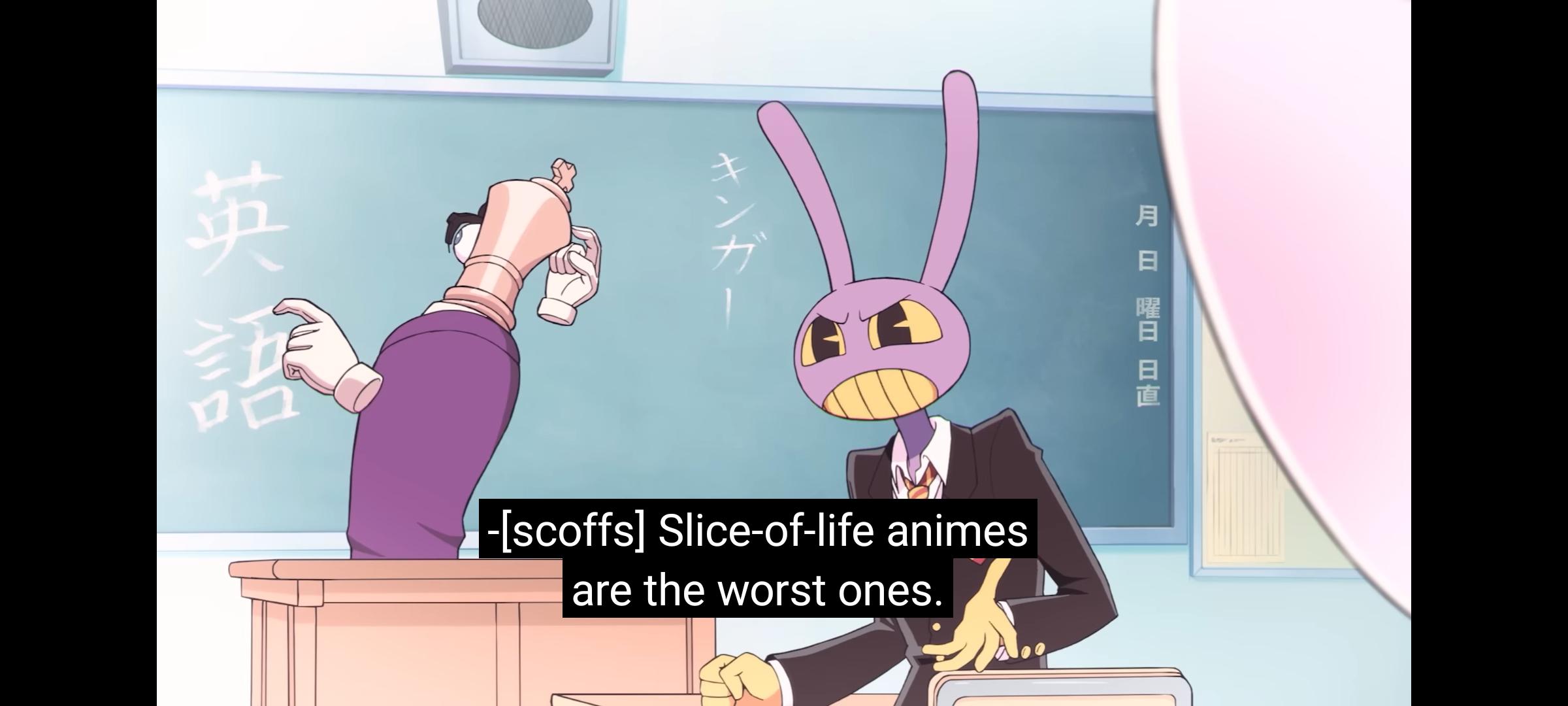 >>152435577>Just going "I want to be alone for a bit" and walking away is a valid way out.So you want a story where all the characters just act rationally all the time and are polite to each other? Jax doesn't just want his space, he wants to repel everyone. Remember, he can't actually escape contact with the others because caine won't let him, so his solution, a bad one, is to be horrible so they won't try to get close to him. Pomni broke his strategy and he let his guard down. That's why he freaked out.