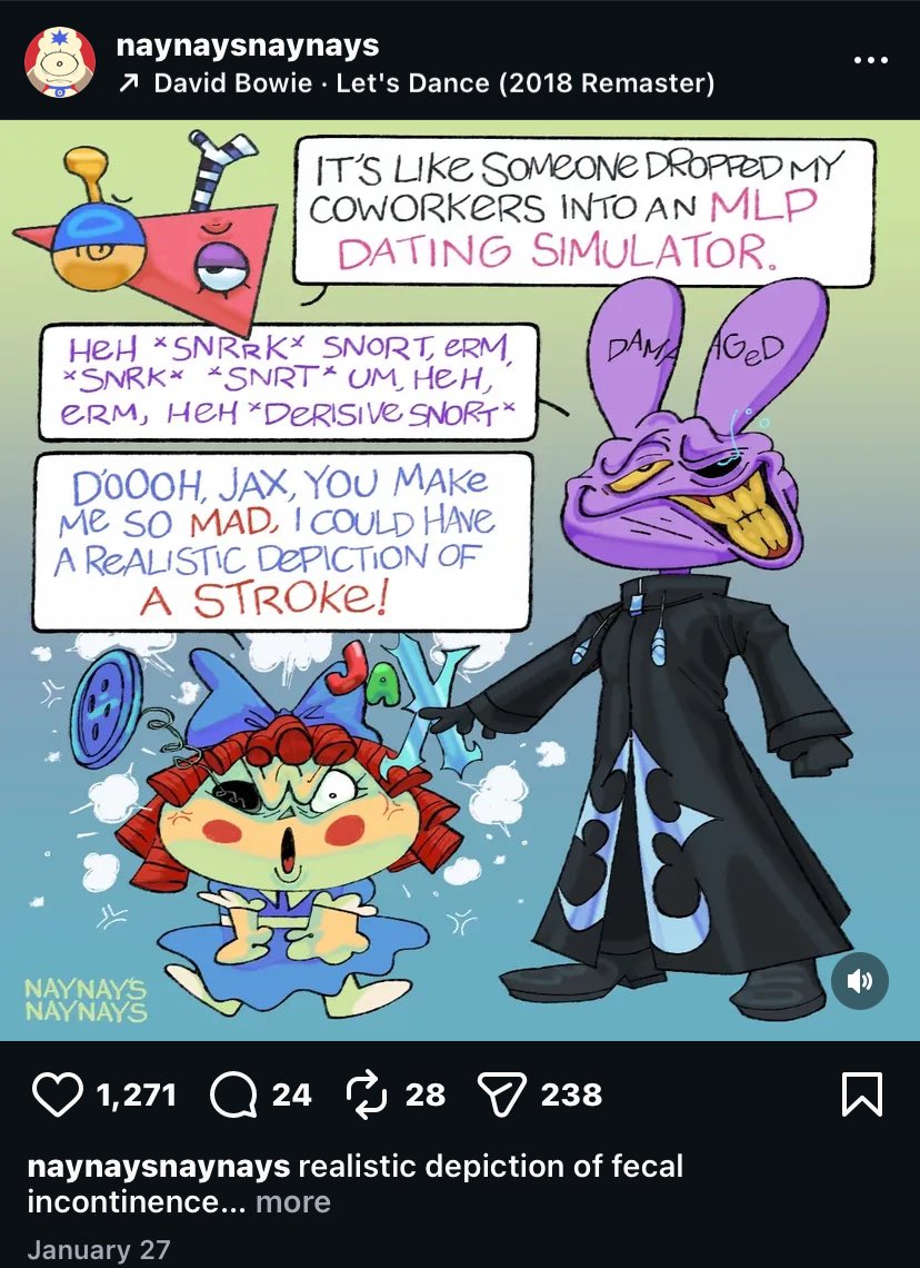Not talking at this thread specifically at all, just ranting about the wider fandom. But colour me fucking triggered, whatever: as someone who watches a lot of live action TV shows for grown ups (and even a lot of cartoons for children), the fandom at large is so intense about disavowing Jax to the point that it's weird as fuck. Like sorry if I'm not sunshine and daisies to be around right before I fully commit to the decision to fucking kill myself. So fucking sorry. I've never encountered a fandom so fixated on disavowing a character, especially when said character's worst crimes are "griefing video games and being kinda cringe and annoying."