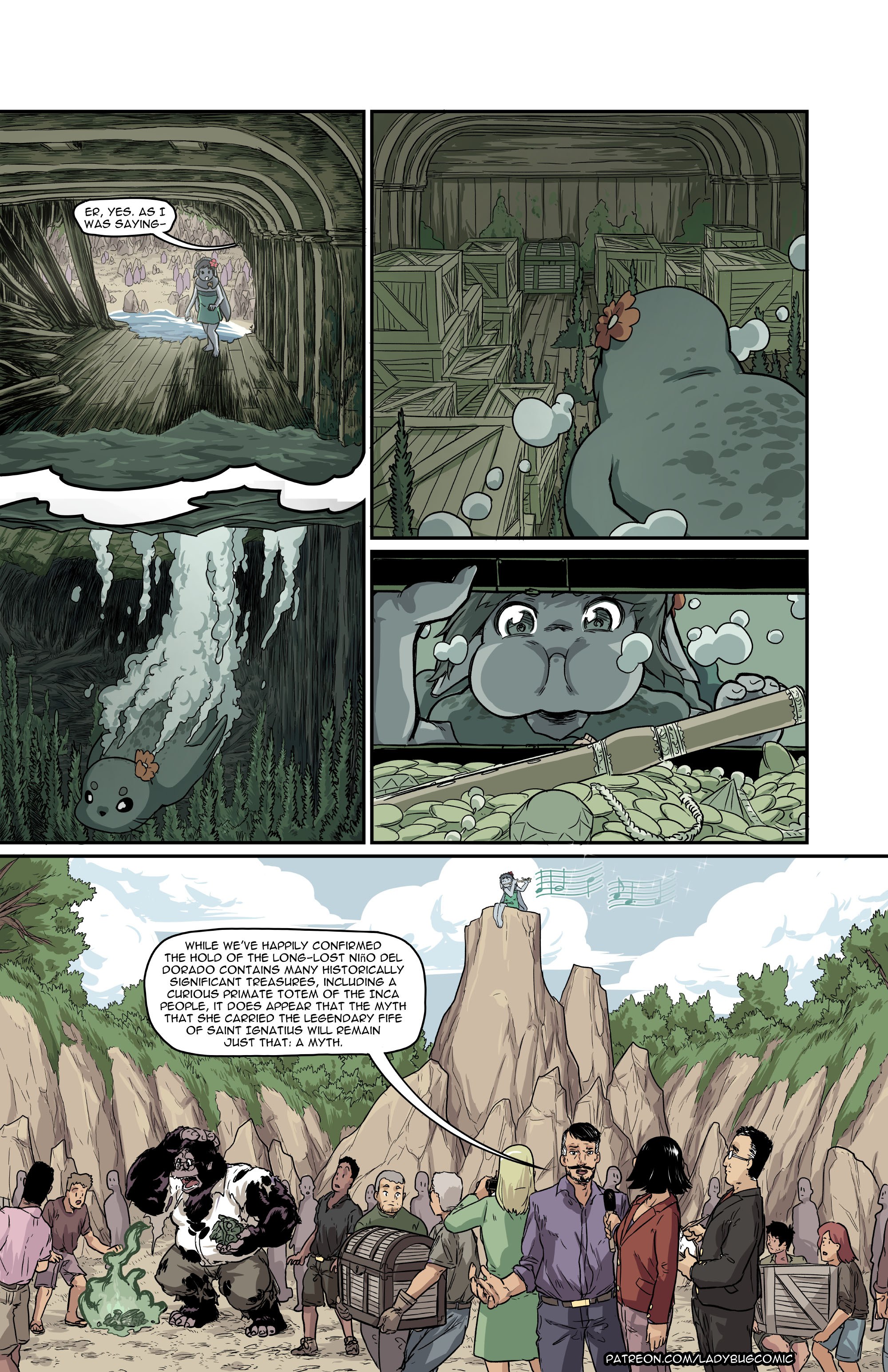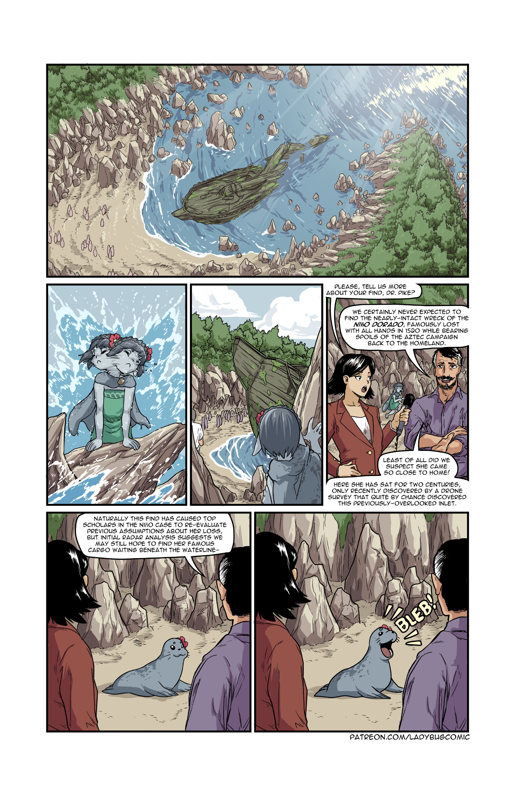 Minicomic is here at last, gonna transpose the blogpost under it cuz it contains a funny story.Your December-January minicomic winner has arrived in all her grey glory! The surreptitious Selkie Lorelei makes her treasure-hunting debut. Witness a bold play to snatch a magical artifact from right under the nose of a scientific salvage crew!This one involved a bit of a comedy of errors. If you look to the last panel, you may (let's be honest, will) spot a familiar face from the Ish #6 previews... one who you might not necessarily expect to share a comic with a Celtic sea fairy.The way I've been writing these is, all the scripts for minicomics go in one big file in the dropbox. If I have a strong idea for a comic, I'll often outline it before the vote is decided, or sometimes even write it out entirely, so there are some scripts in there that don't correspond to a finished mini.Partway through working out Lorelei's script, I got a basic idea for a Kongquistador mini, so I write it down past the end of this one. Shortsteel interpreted this as Kong being present in the final panel, transforming into his familiar gorilla form while handling some loot from the wreck. Weirdly, this sort of worked- Kong was a museum curator prior to his monkey metamorphosis, so a shipwreck laden with treasures from the age of sail would be well within his field of expertise. With Kong already in the inked panel, we quickly reworked the ship from a British vessel from the Napoleonic Wars into a Spanish one returning from the Americas. The time frame gets a bit fuzzy so this might get tweaked a bit if Kongquistador gets his own mini, but we'll climb that skyscraper when we come to it. For now, enjoy the odd happenstance as the gorilla crashes the seal's party!