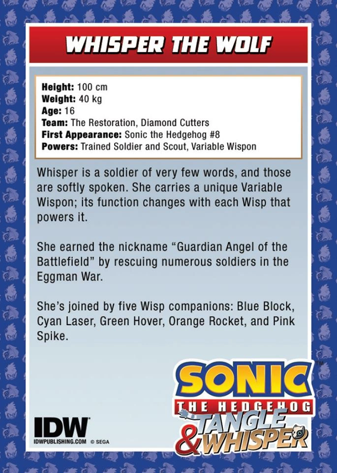 >>152447706Introduced early in the IDW reboot, also the extendable tail gimmick, and can keep up with Sonic with a similar personality to Sonic's in a athletic girl can do attitude. Bland enough to help support the story without overpowering the main cast in interest. Compare her to Tangle to which they made several story arcs that ended up subpar at the best of times along with giving her a arch enemy, Mimic, who turned out to be a dud villain at the end. Tangle at least had natural popularity growth but Whisper is a much more obvious industry plant.
