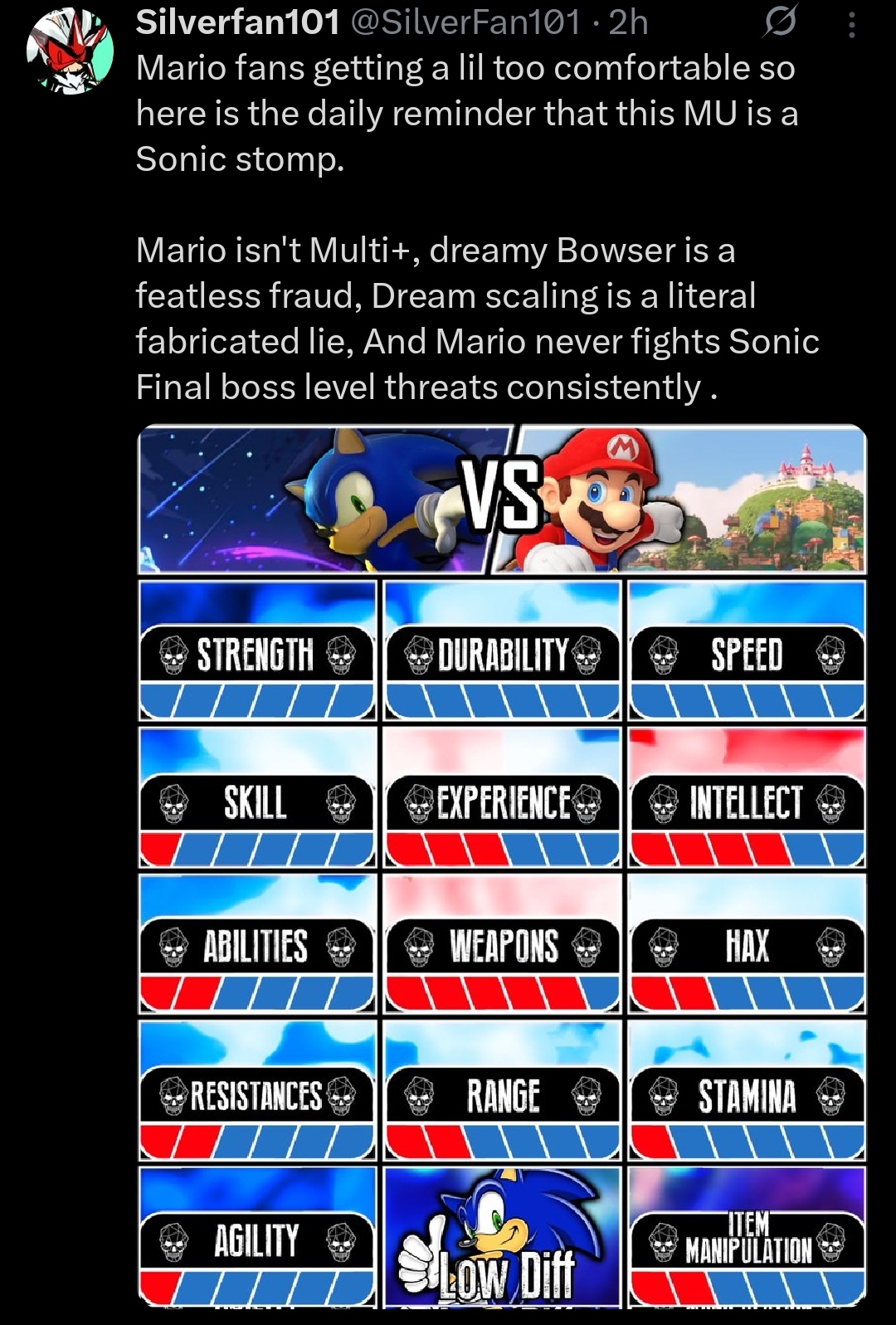 >>152453909I've played Sonic games and never played anything MarioHow the fuck is Sonic winning the strength category when Mario's castle toss exists