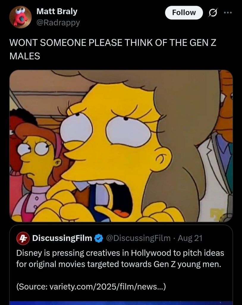 >>152467165>>152468452No, but really. Why did Matt tweet that? I’m guessing the implication is that too much media is aimed at Gen Z males. Which is kind of an unfair thing to say after Disney bought Star Wars and swiftly destroyed any interest Gen Z males had in it.It’s odder that he tweeted this while in the middle of working on a movie aimed for the Gen Z audience