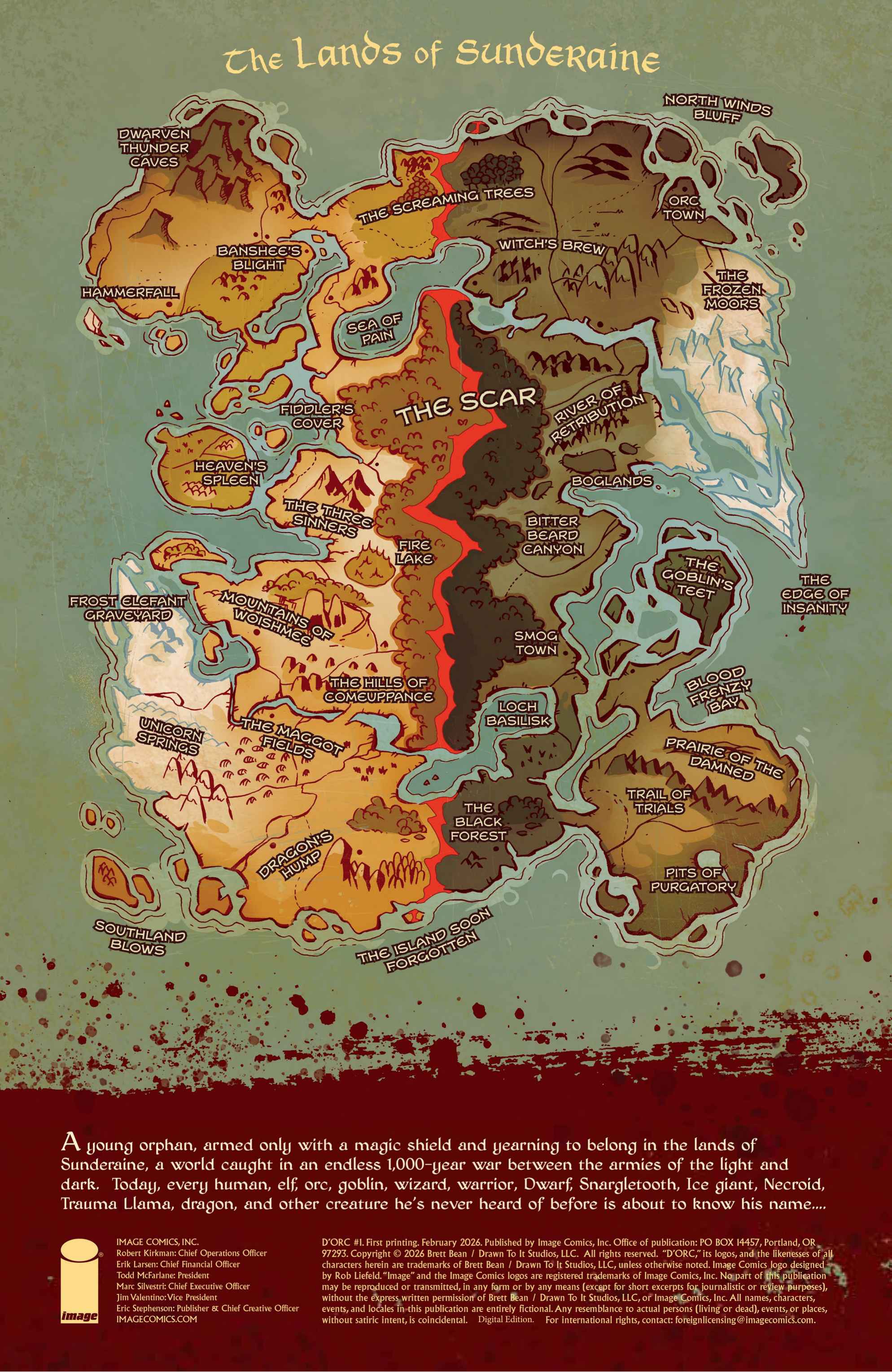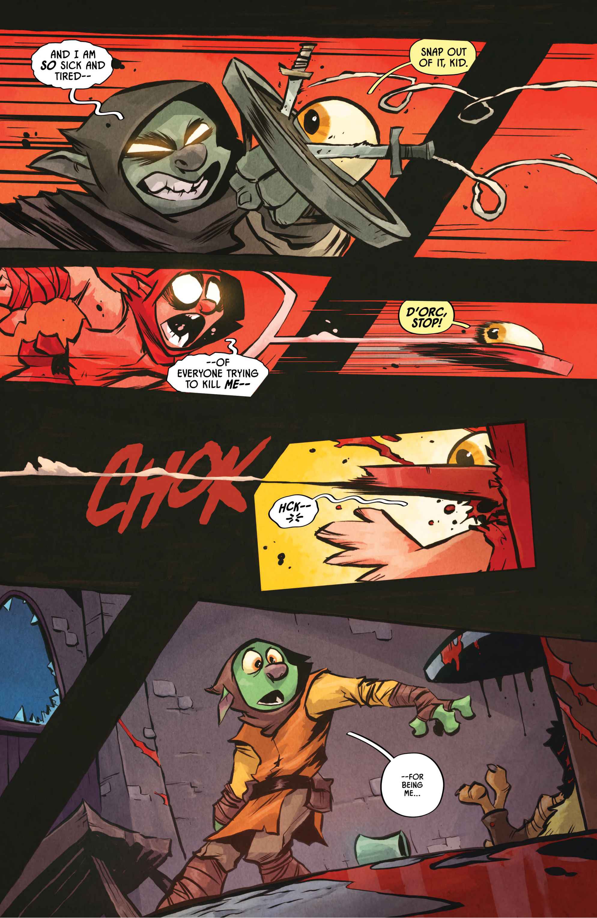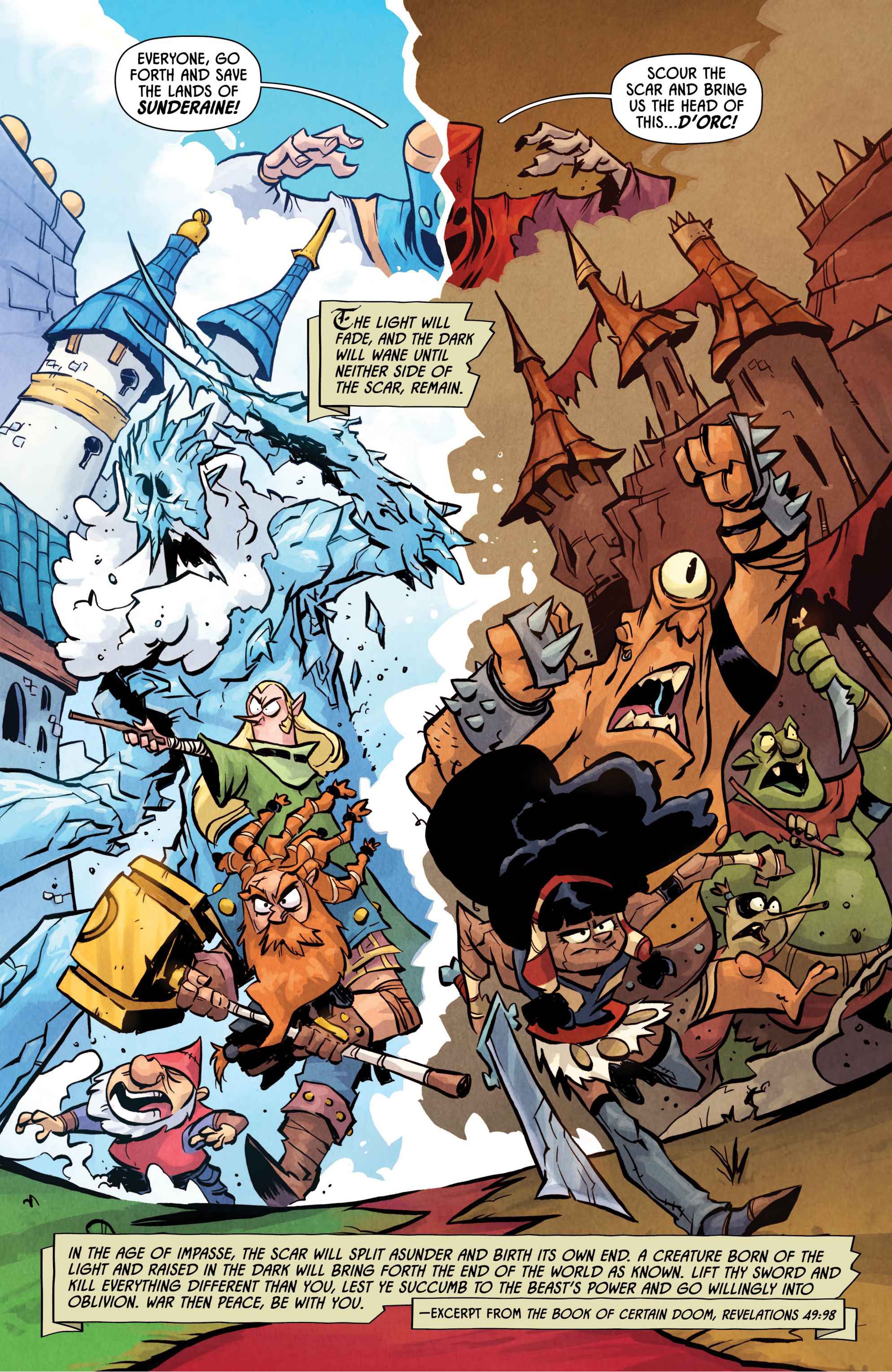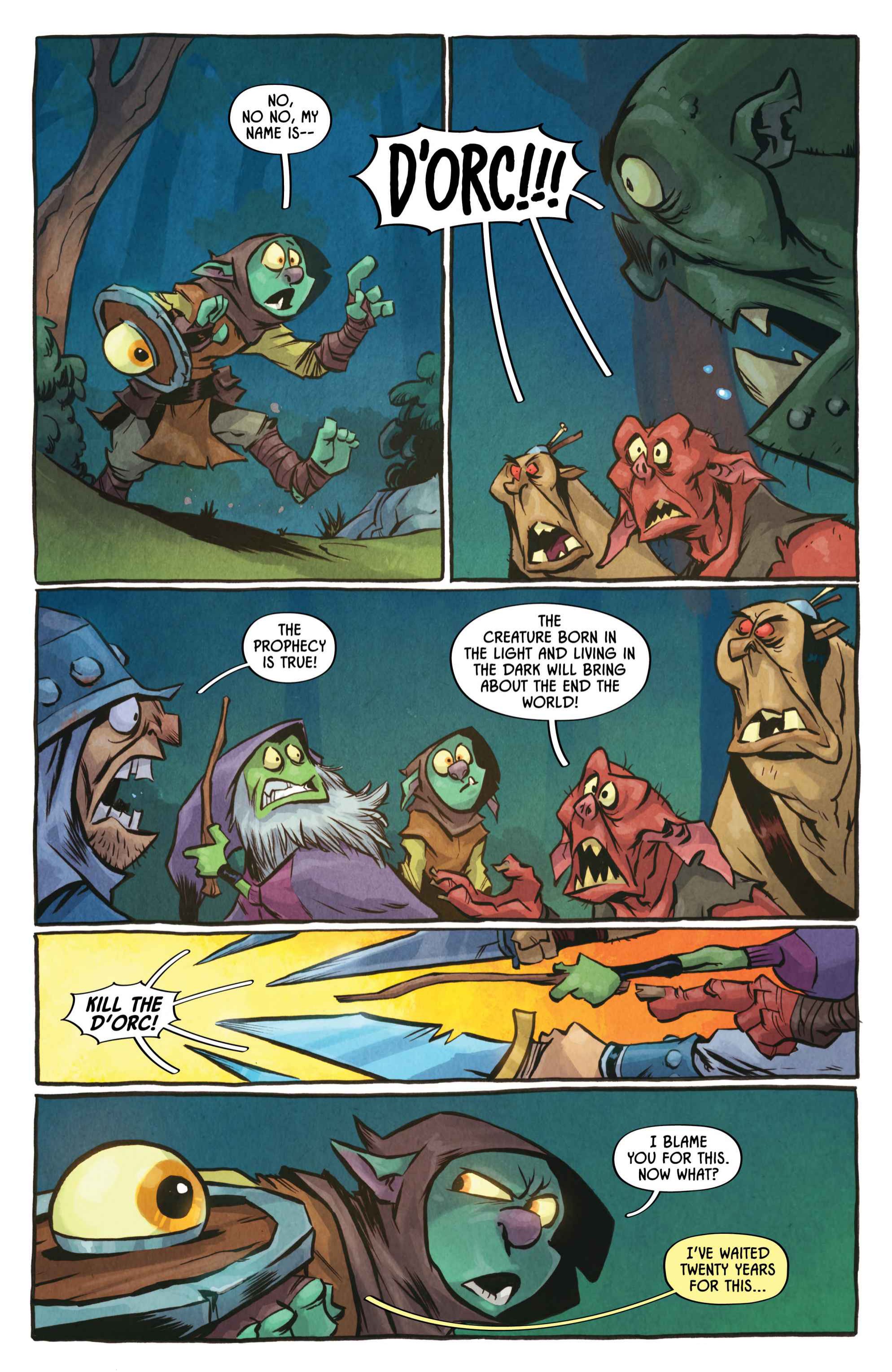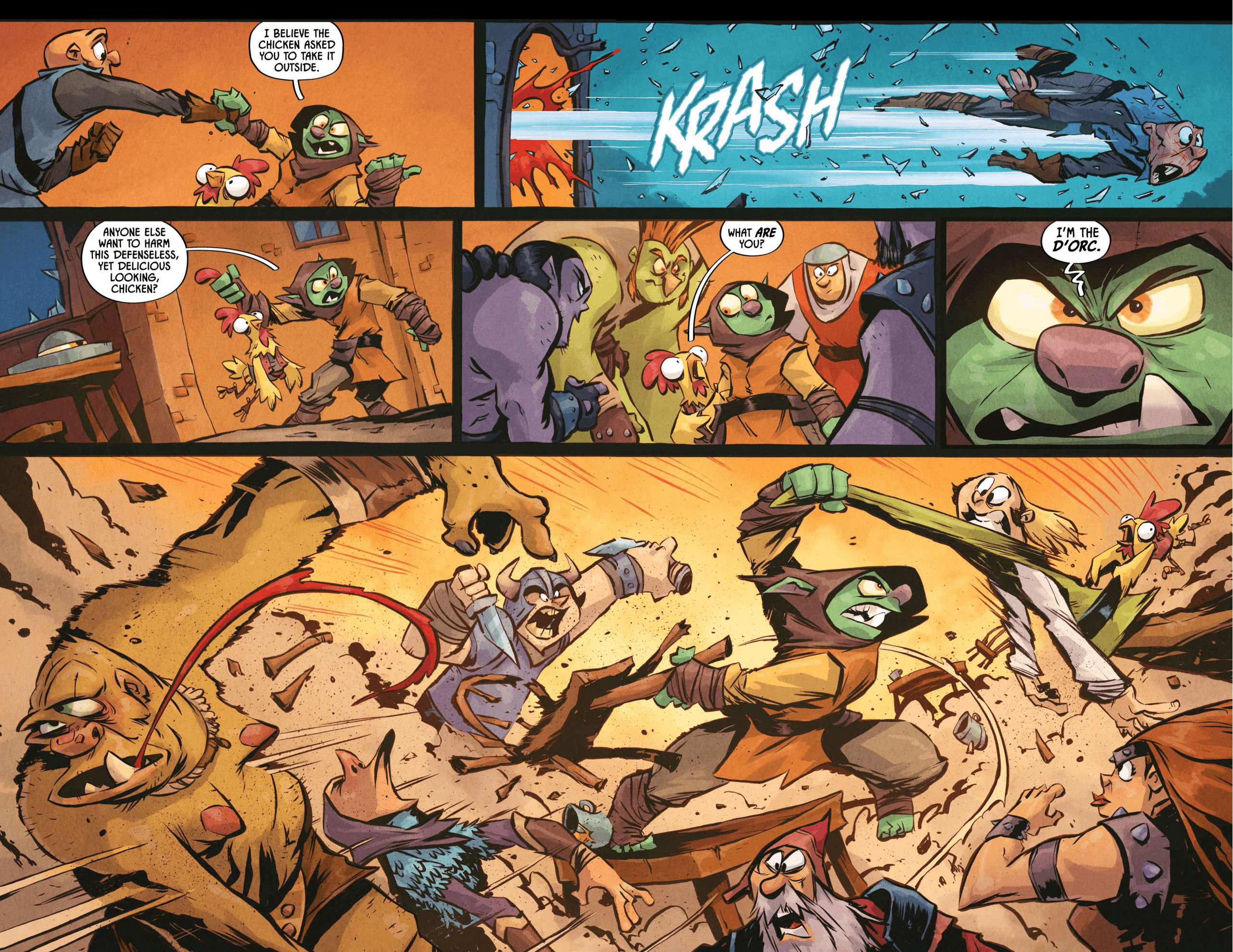 from the artist who worked on the I hate fairyland comic>Armed with nothing but a magical yet ambitiously violent shield, a lonely orphan stumbles headfirst into Sunderaine’s never-ending war between the Light and Dark. Elves vs. Orcs. Wizards vs. Common Sense. Dragons vs. Literally Everyone. And caught dead-center? D'ORC.With a wholly inconvenient doomsday prophecy, the half dwarf, half orc — all D'ORC — is fated to end the world. Soon, every human, elf, goblin, dwarf, Snargletooth, Necroid, Ice Giant, Trauma Llama, and at least three other unpronounceable magical creatures, will know his name and want him dead. There will also be a chicken.