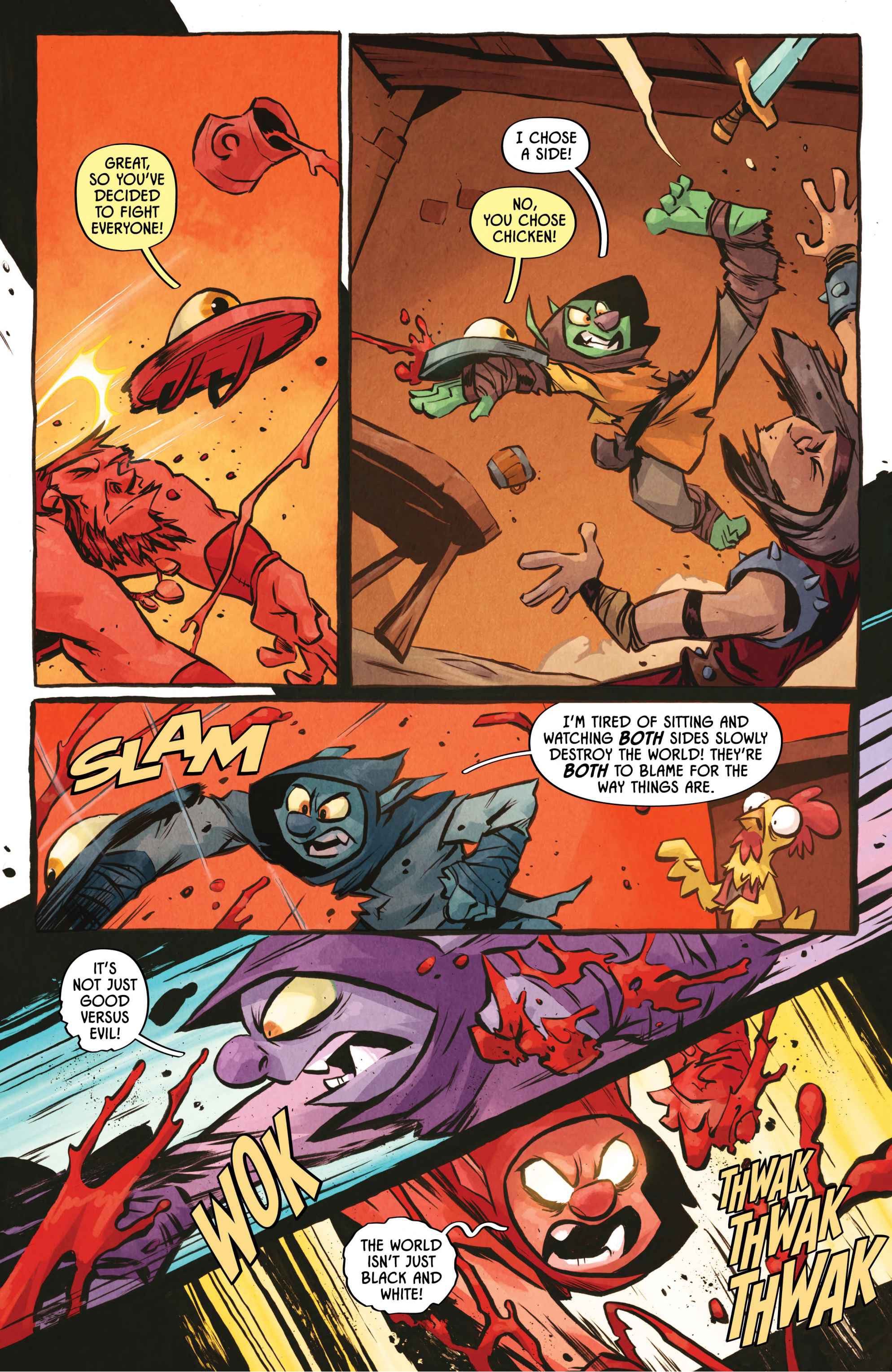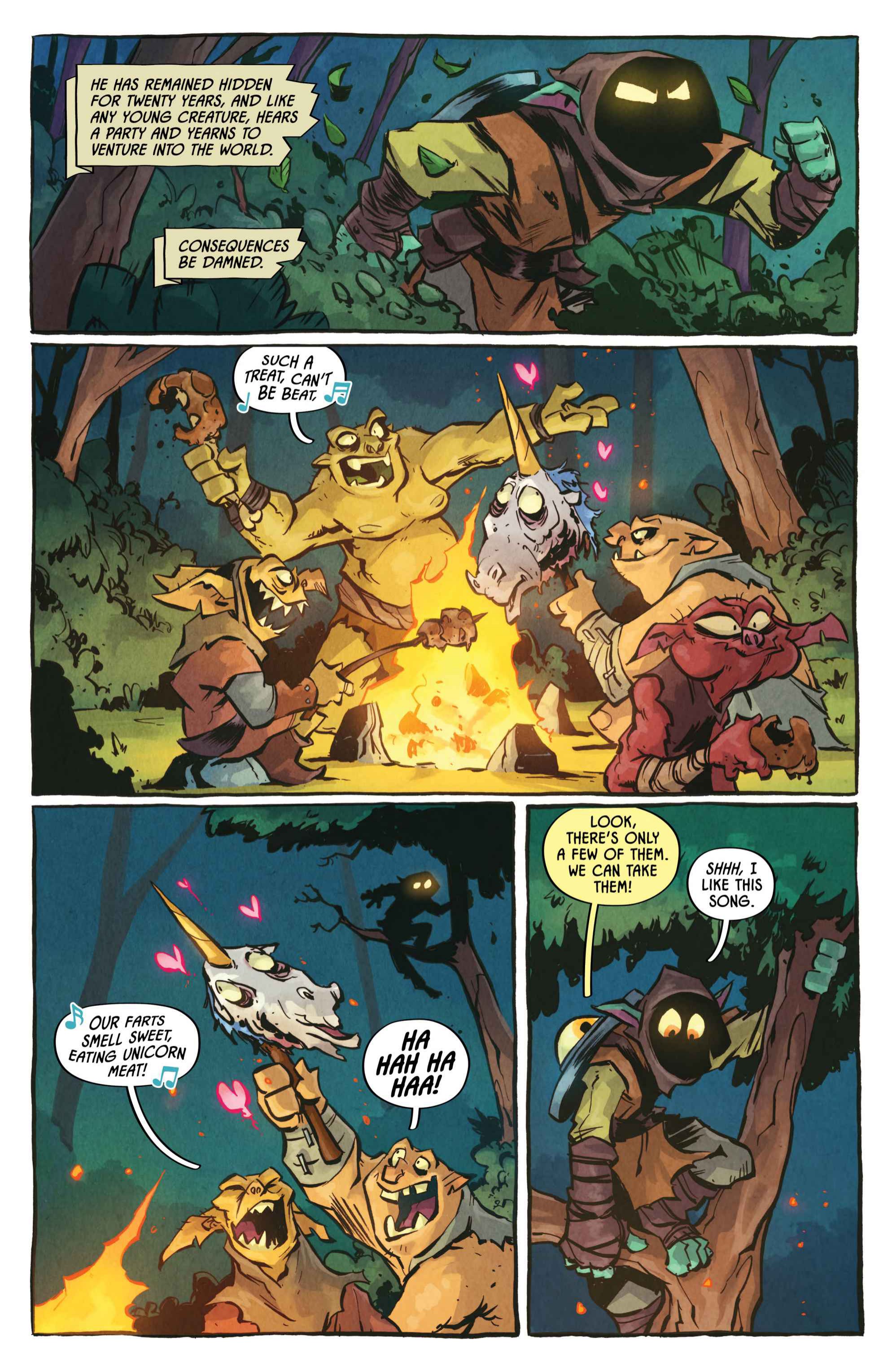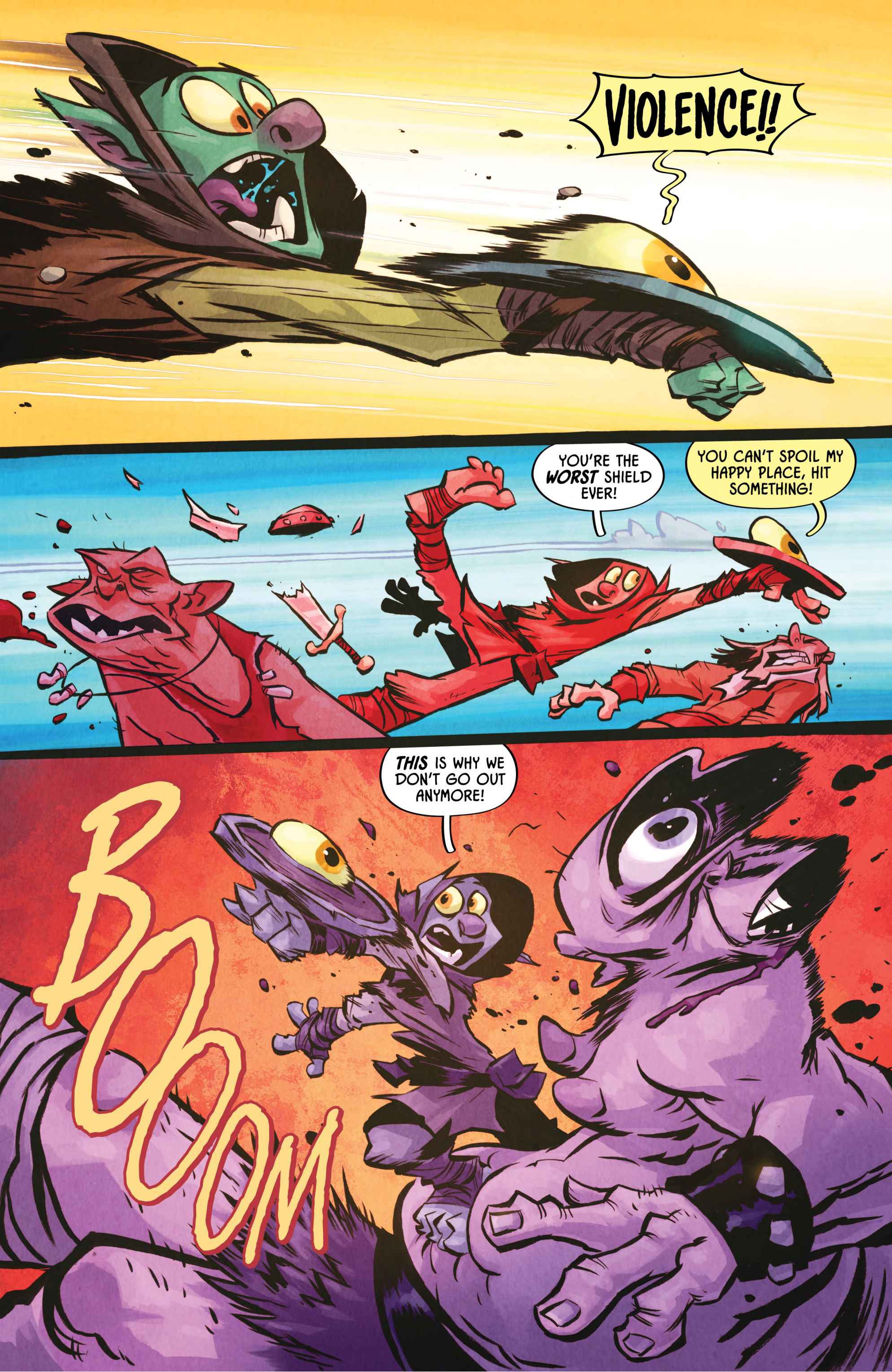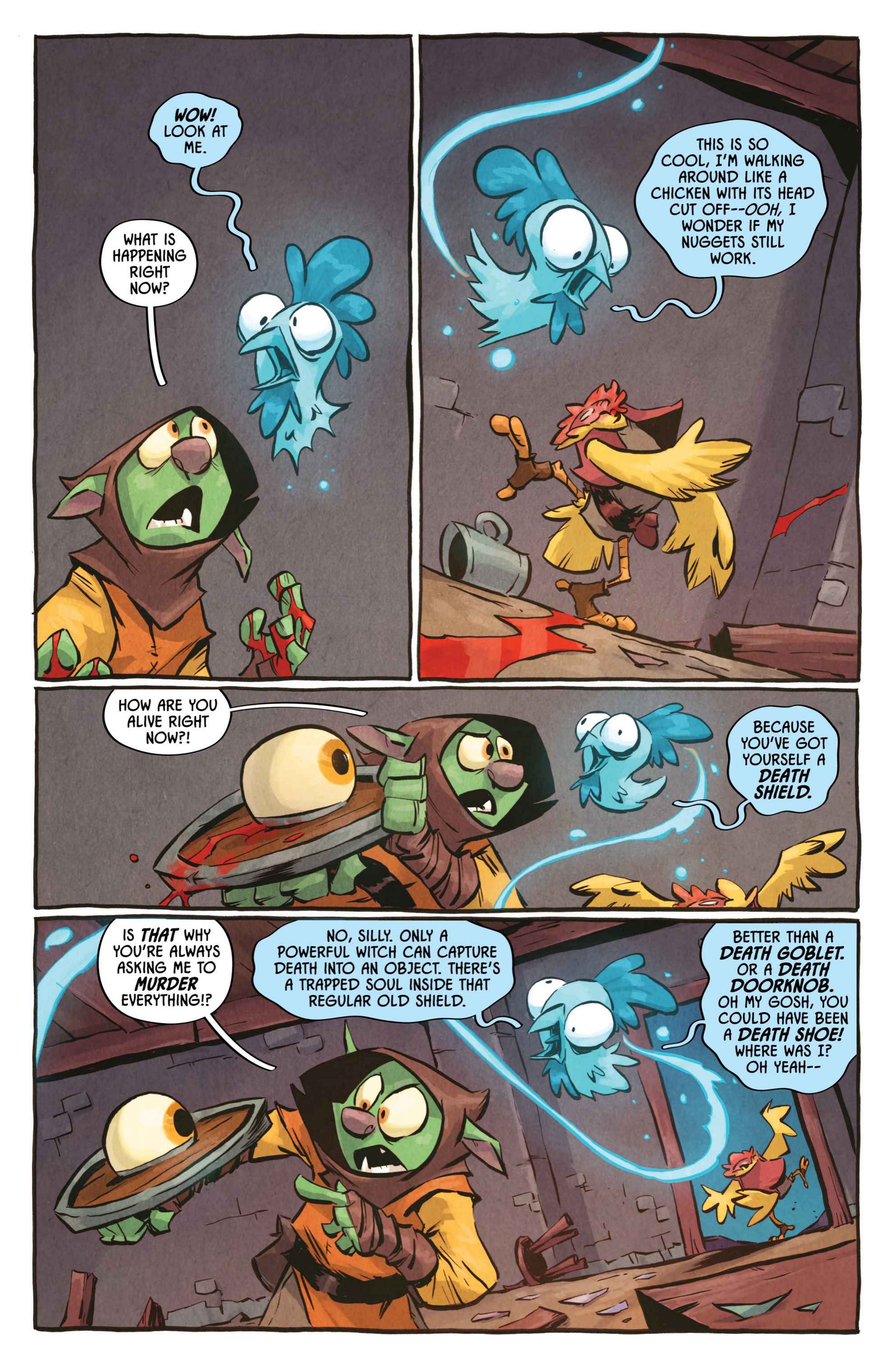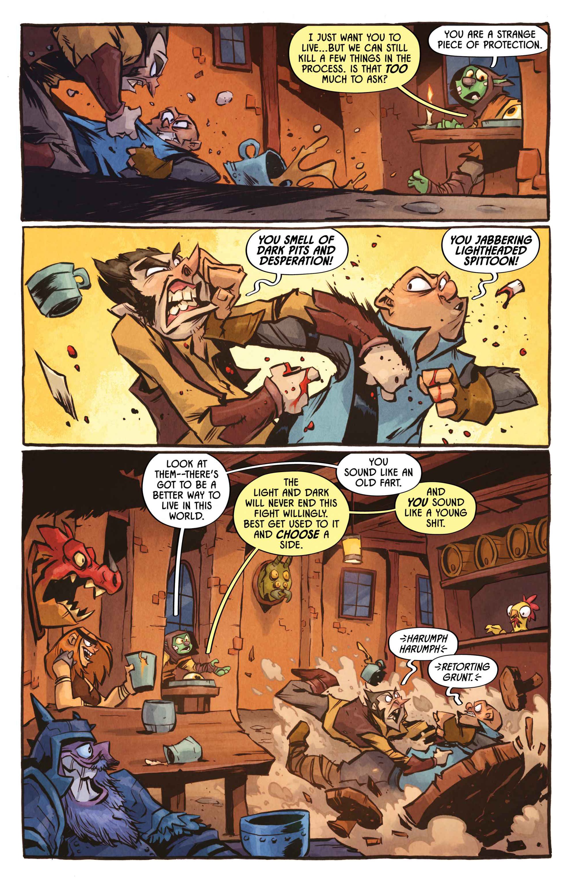 from the artist who worked on the I hate fairyland comic>Armed with nothing but a magical yet ambitiously violent shield, a lonely orphan stumbles headfirst into Sunderaine’s never-ending war between the Light and Dark. Elves vs. Orcs. Wizards vs. Common Sense. Dragons vs. Literally Everyone. And caught dead-center? D'ORC.With a wholly inconvenient doomsday prophecy, the half dwarf, half orc — all D'ORC — is fated to end the world. Soon, every human, elf, goblin, dwarf, Snargletooth, Necroid, Ice Giant, Trauma Llama, and at least three other unpronounceable magical creatures, will know his name and want him dead. There will also be a chicken.