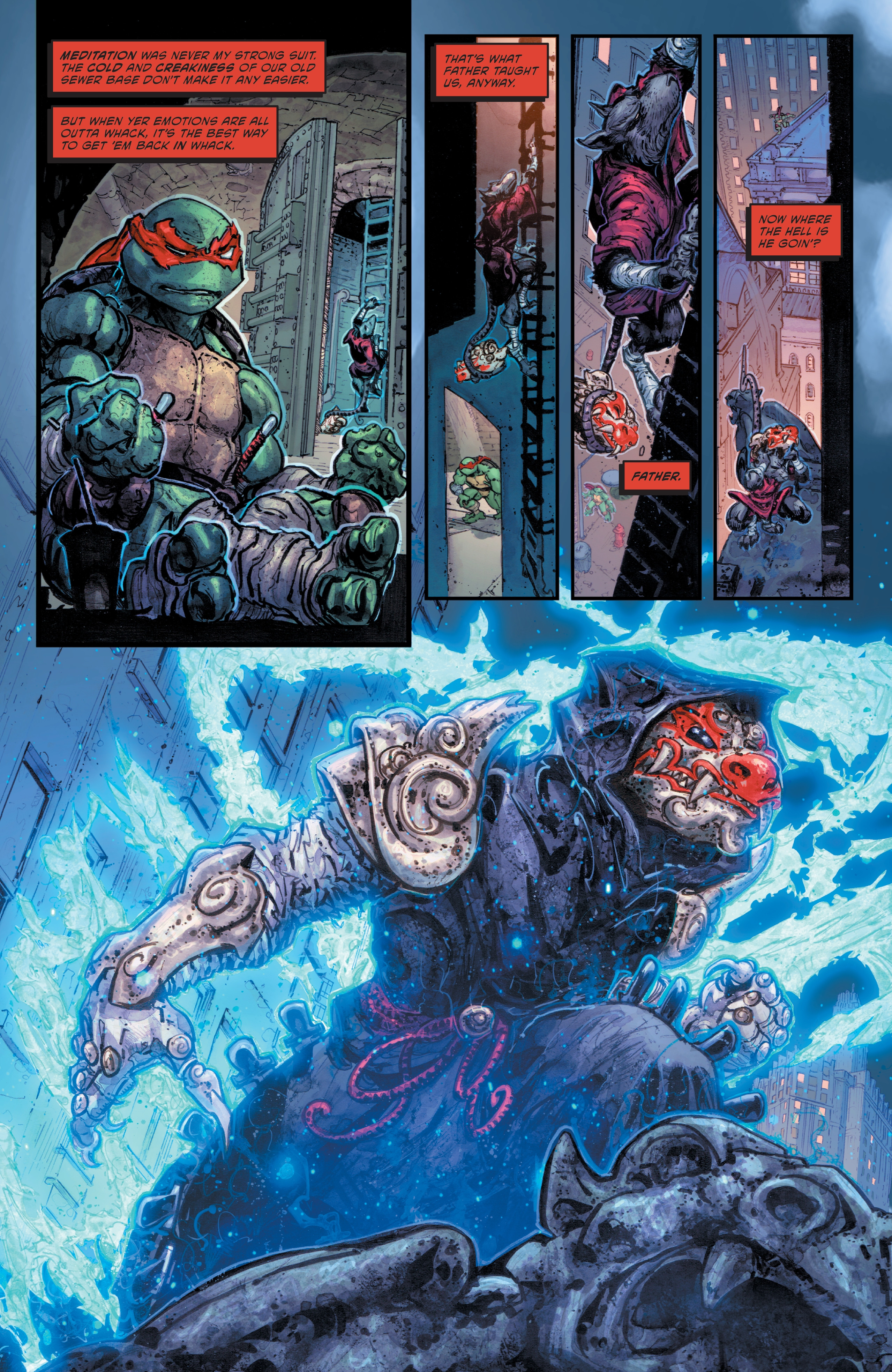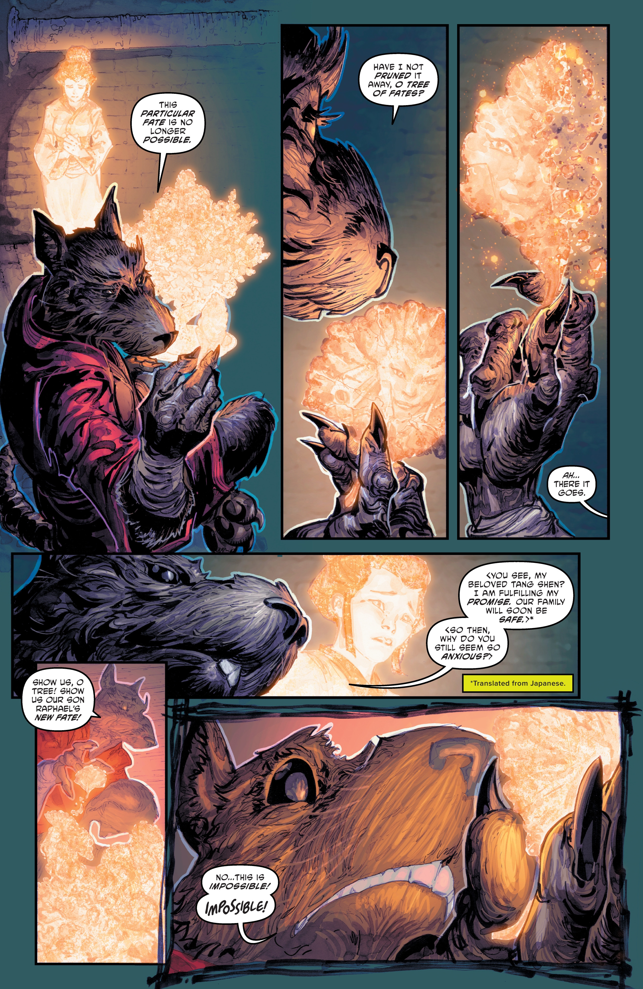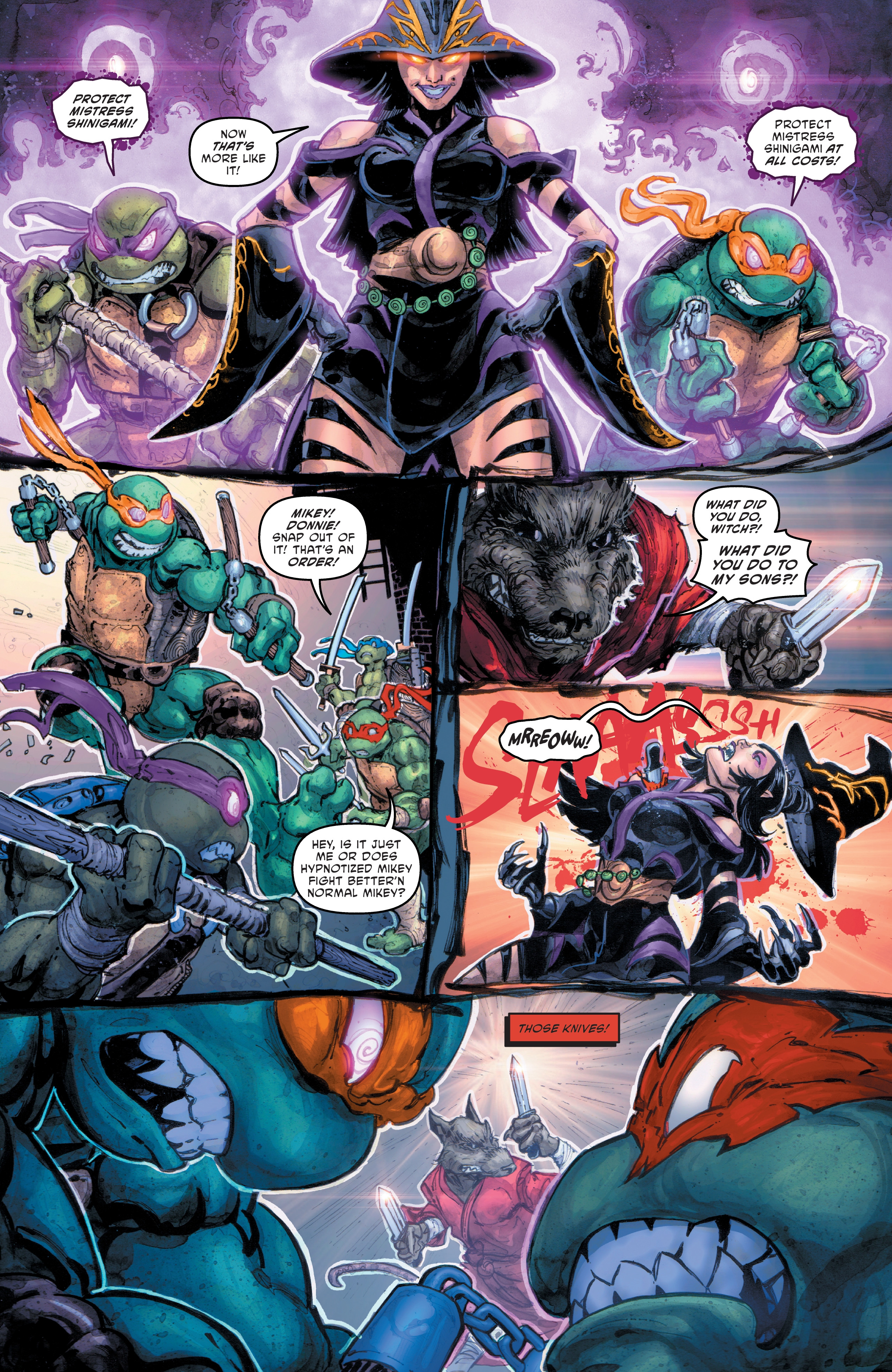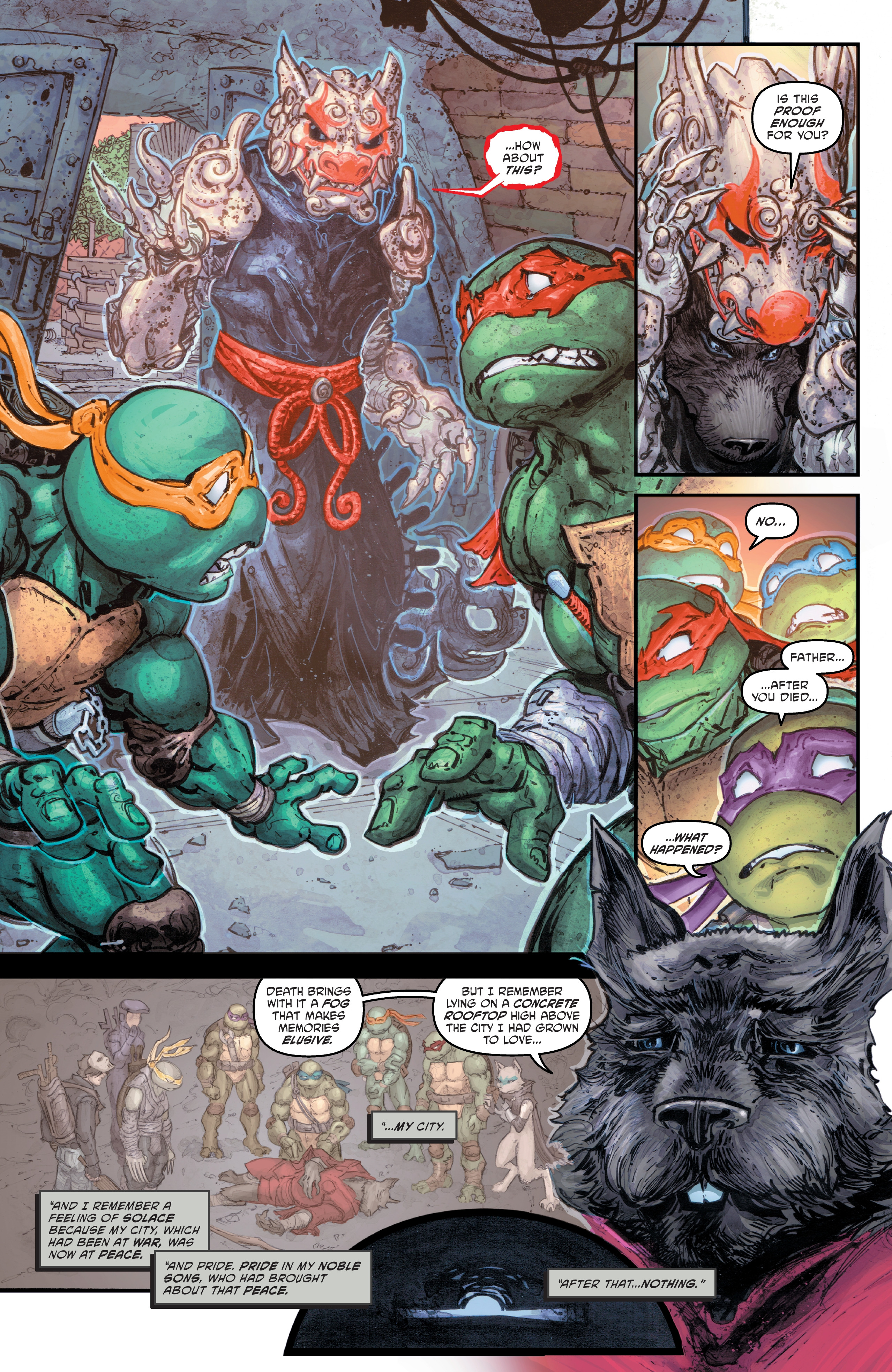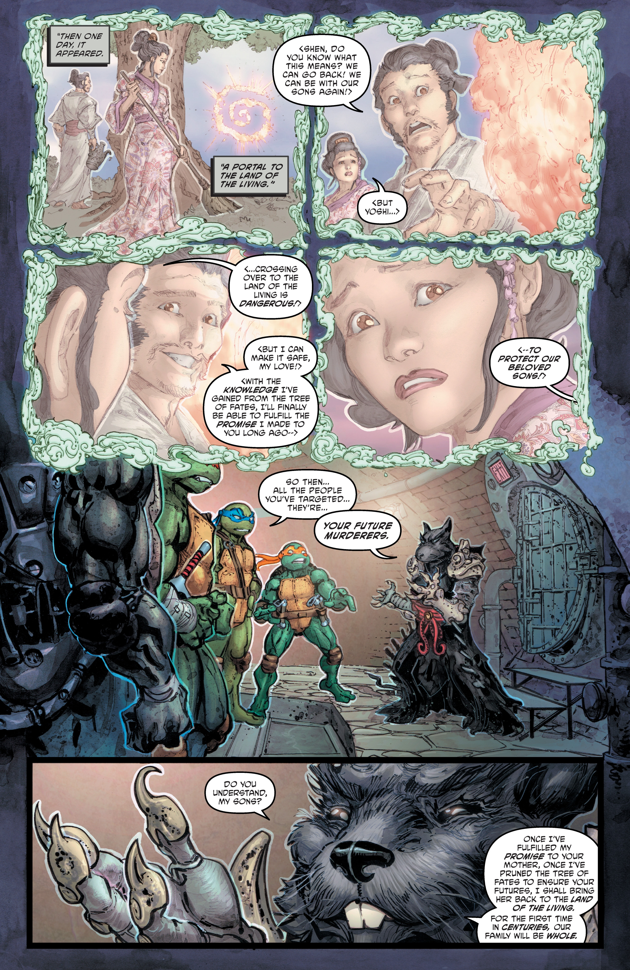 >Father and sons, together again! The Turtles are overjoyed to have Splinter back with them, but there are dark things lurking in the shadows—a mysterious new magic-wielding foe disrupts the family reunion! The Turtles also learn who Ujigami's next target is, and the race is on to save one of their greatest allies!