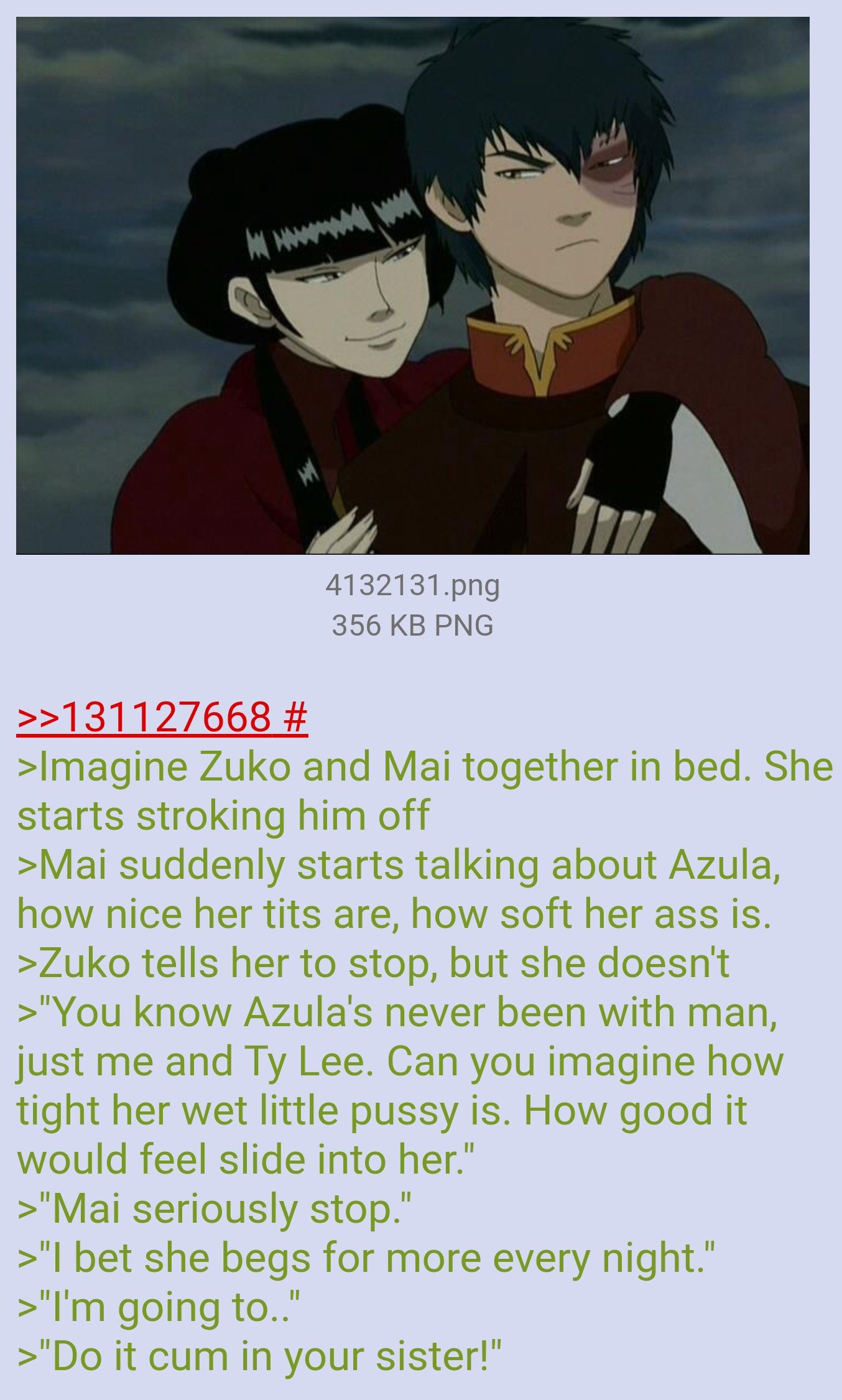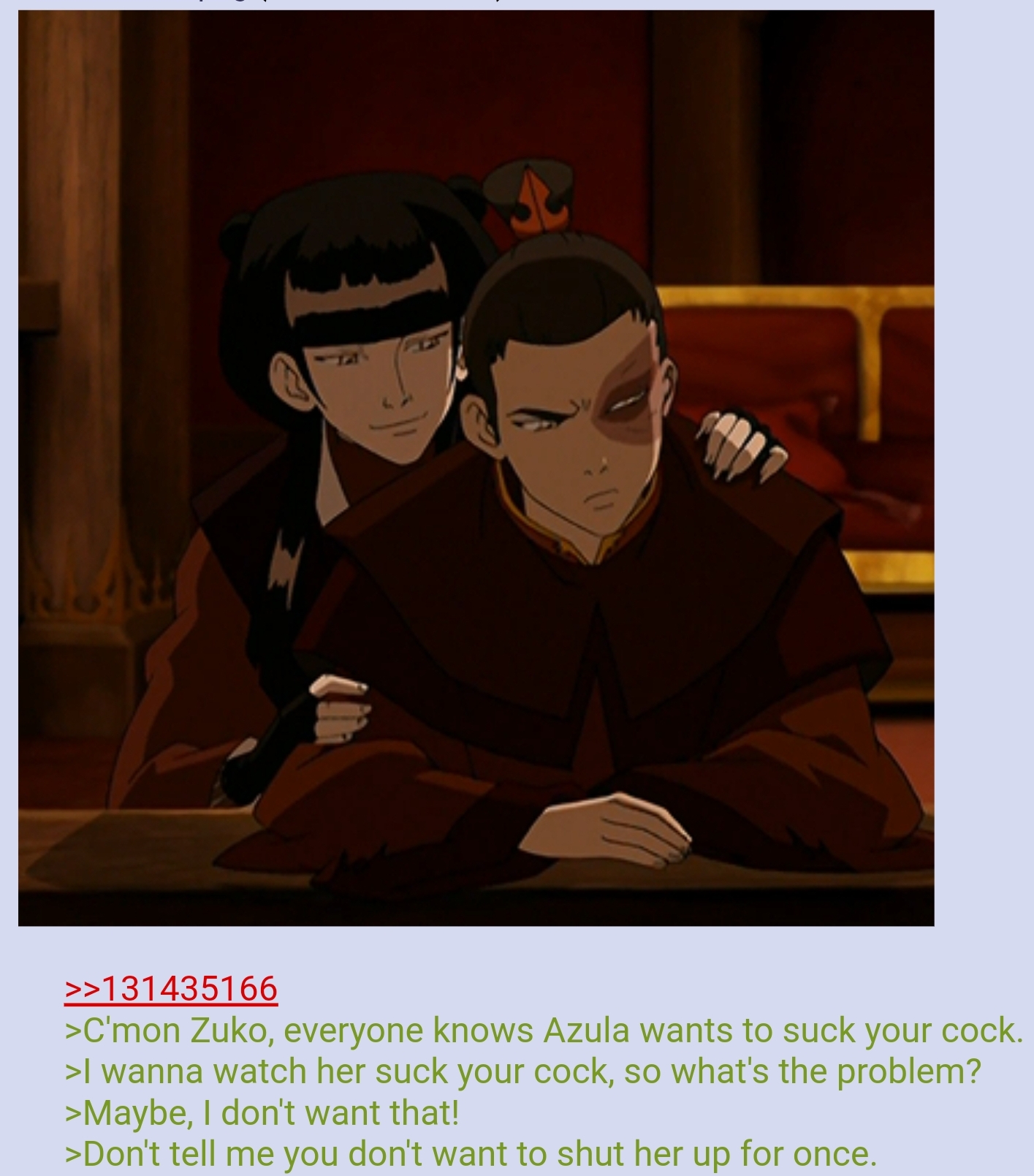 >>152482470>pairs Azula with ZukoNo one does that except anons when they want to jack off to incest porn.