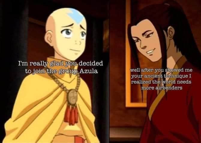 So we're agreed that Azula should be Aang's brood sow to help repopulate the Air Nomads?