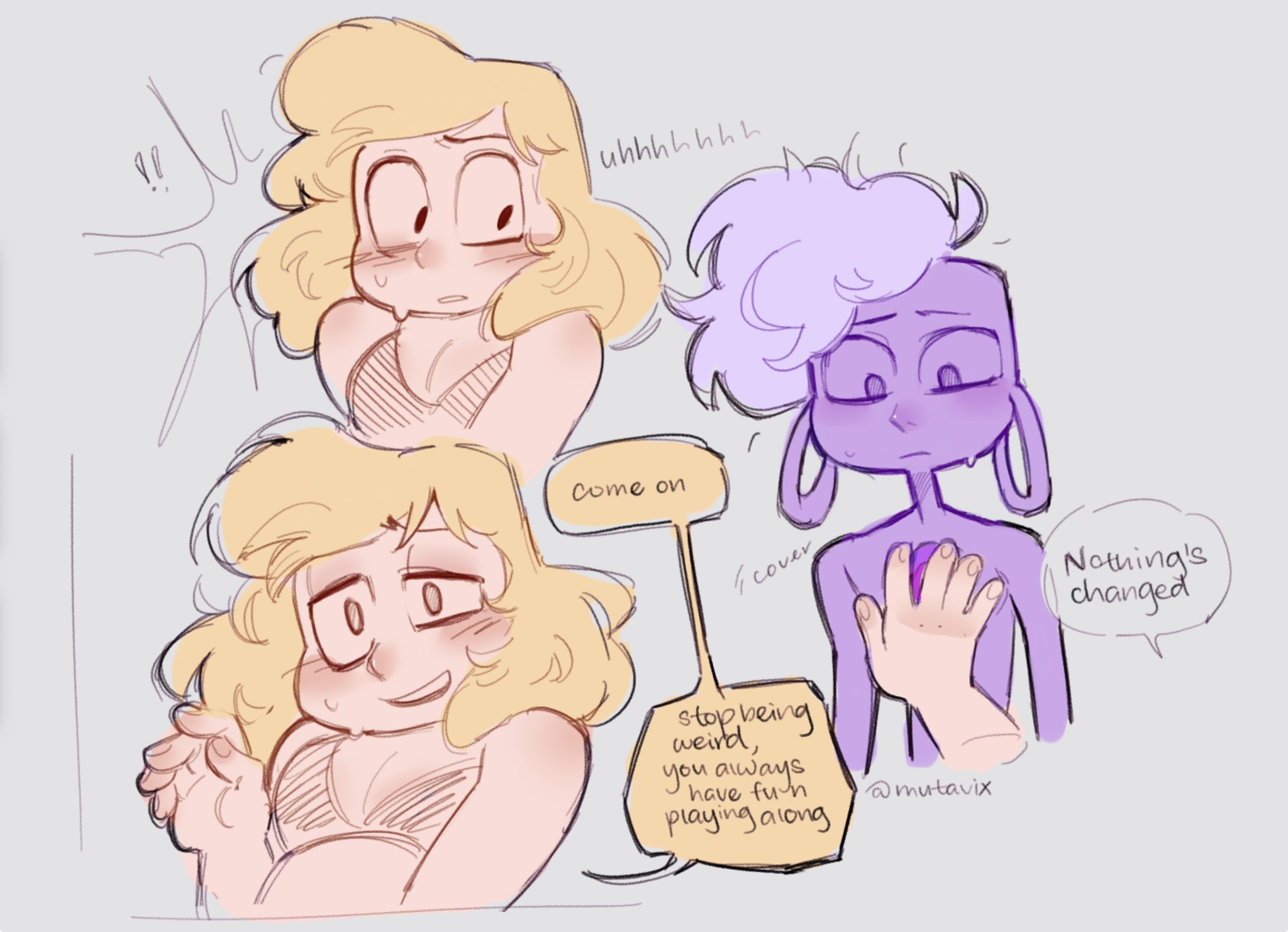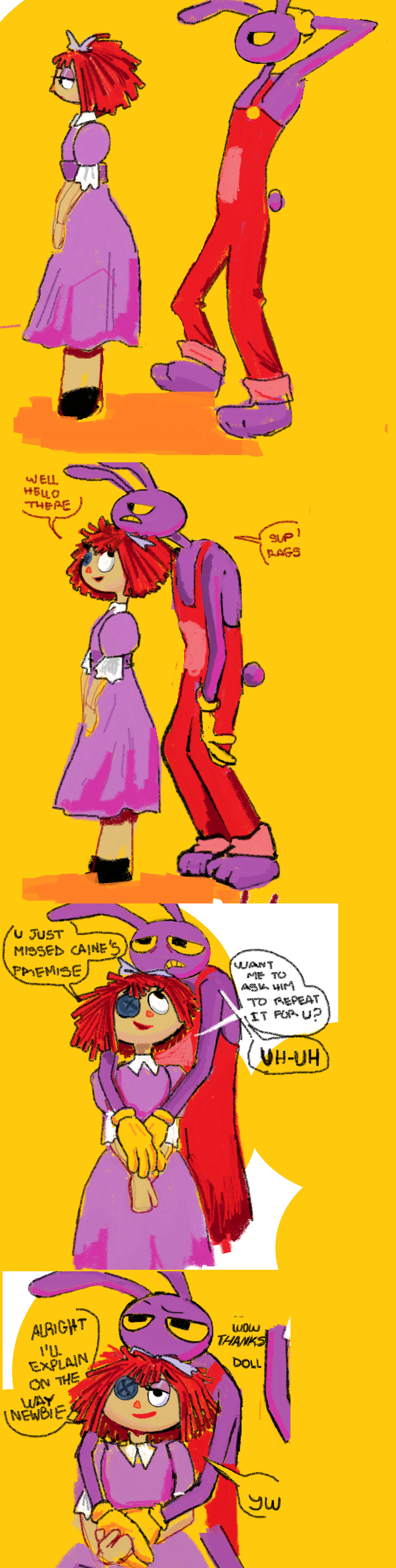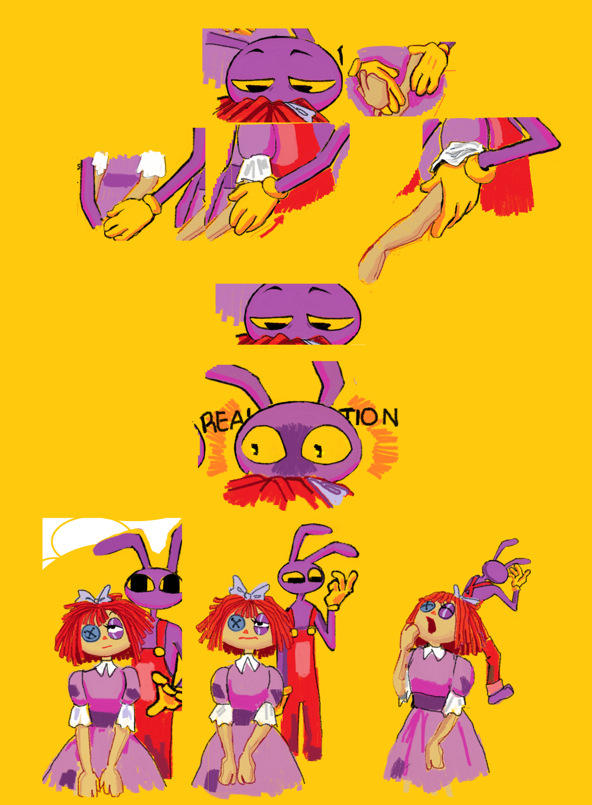 >>152489344In the past Jax and Ragatha were on much friendlier terms with each other to the point they were comfortable with casually touching each other. Jax starts caressing Ragatha's arm, something he's never done before, and it hits him how intimate he's being with her and it freaks him out.